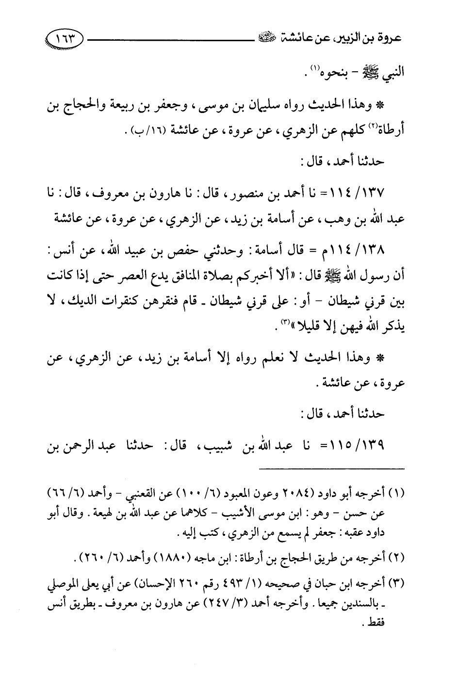 137- حدثنا أحمد بن منصور، قالَ: حَدَّثَنا هارون بن معروف، قالَ: حَدَّثَنا عبد الله بن وهب , عن أسامة بن زيد , عن الزهري , عن عروة , عن عائشة رضي الله عنها.