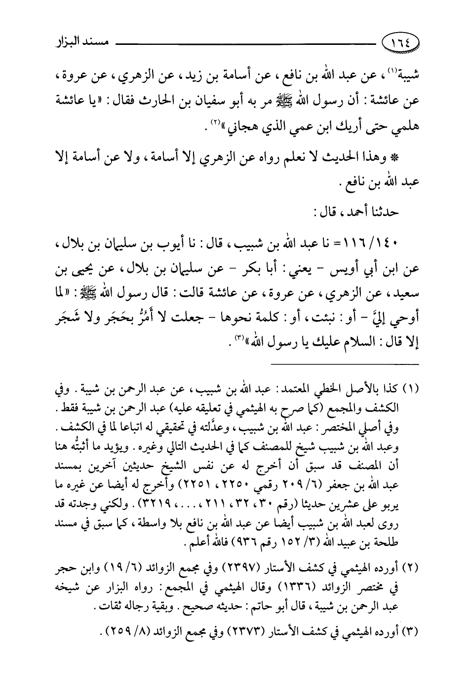 140- حدثنا عبد الله بن شبيب، قالَ: حَدَّثَنا أيوب بن سليمان بن بلال , عن ابن أبي أويس يعني أبا بكر , عَنْ سُلَيْمَانَ بْنِ بِلالٍ , عَنْ يَحْيَى بْنِ سعيد , عن الزهري , عن عروة , عن عائشة رضي الله عنها قالت: قَالَ رَسُولُ اللَّهِ صَلَّى اللَّهُ عَلَيْهِ وَسَلَّمَ: لما أوحي إلي أو نبئت أو كلمة نحوها جعلت لا أمر بحجر ولا شجر إلا قال السلام عليكم يا رسول اللَّهِ.