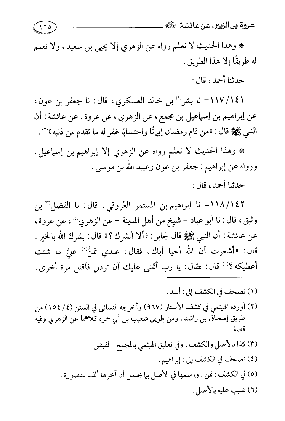 141- حدثنا بشر بن خالد العسكري، قالَ: حَدَّثَنا جعفر بن عون , عن إبراهيم بن إسماعيل بن مجمع , عن الزهري , عن عروة , عن عائشة رضي الله عنها أَنَّ النَّبِيَّ صَلَّى اللَّهُ عَلَيْهِ وَسَلَّمَ قَالَ: من قام رمضان إيمانا واحتسابا غفر له ما تقدم من ذنبه.