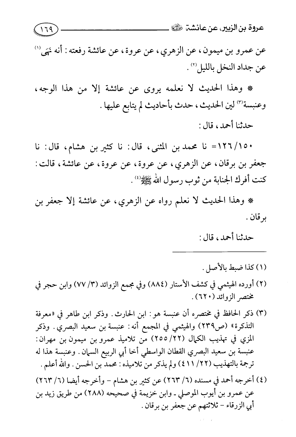 150- حدثنا محمد بن المثنى، قالَ: حَدَّثَنا كثير بن هشام، قالَ: حَدَّثَنا جعفر بن برقان , عن الزهري , عن عروة , عن عائشة رضي الله عنها قالت: كنت أفرك الجنابة من ثوب رَسُولِ اللَّهِ صَلَّى اللَّهُ عَلَيْهِ وَسَلَّمَ.