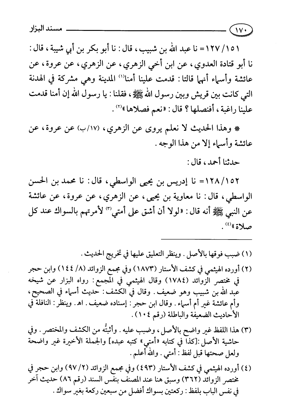 152- حدثنا إدريس بن يحيى الواسطي، قالَ: حَدَّثَنا محمد بن الحسن الواسطي، قالَ: حَدَّثَنا معاوية بن يحيى , عن الزهري , عن عروة , عن عائشة رضي الله عنها , عَنِ النَّبِيِّ صَلَّى اللَّهُ عَلَيْهِ وَسَلَّمَ أَنَّهُ قال: لولا أن أشق على أمتي لأمرتهم بالسواك عند كل صلاة.