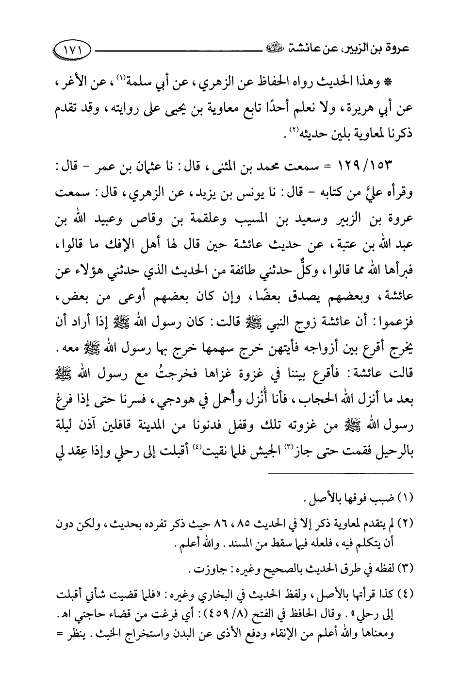 153- سمعت محمد بن المثنى، قالَ: حَدَّثَنا عثمان بن عمر قال وقرأه علي من كتابه، قالَ: حَدَّثَنا يونس بن يزيد , عن الزهري قال سمعت عروة بن الزبير وسعيد بن المسيب وعلقمة بن وقاص وعبيد اللَّهِ بْنِ عَبْدِ اللَّهِ بْنِ عُتْبَةَ , عَنِ حديث عائشة حين قال لها أهل الإفك ما قالوا فبرأها الله مما قالوا وكل حدثني طائفة من الحديث الذي حدثني هؤلاء , عن عائشة رضي الله عنها وبعضهم يصدق بعضا وإن كان بعضهم أوعى من بعض فزعموا أن عائشة زوج النبي صلى الله عليه وسلم قالت كَانَ رَسُولُ اللَّهِ صَلَّى اللَّهُ عَلَيْهِ وَسَلَّمَ إذا أراد أن يخرج أقرع بين أزواجه فأيتهن خرج سهمها خرج بِهَا رَسُولُ اللَّهِ صَلَّى اللَّهُ عَلَيْهِ وَسَلَّمَ معه. قالت عائشة فأقرع بيننا في غزوة غزاها فخرجت مَعَ رَسُولِ اللَّهِ صَلَّى اللَّهُ عَلَيْهِ وَسَلَّمَ بعد ما أنزل الله الحجاب فأنا أنزل وأحمل في هودجي فسرنا حتى إذا فرغ رَسُولِ اللَّهِ صَلَّى اللَّهُ عَلَيْهِ وَسَلَّمَ مِنْ غزوته تلك وقفل فدنونا من المدينة قافلين آذن ليلة بالرحيل فقمت حتى جاز الجيش فلما نقيت أقبلت إلى رحلي وإذا عقد لي من جزع أظفار أو جزع , شك أبو محمد , قد انقطع فرجعت فالتمست عقدي فحبسني ابتغاؤه. وأقبل الرهط الذين كانوا يرحلون على بعيري الذي كنت أركب عليه وهم يحبسون أني فيه والنساء إذ ذاك خفاف لم يحملن اللحم إنما نأكل العلقة من الطعام فلم يستنكر القوم خفة الهودج وكنت جارية حديثه السن فوجدت عقدي بعد ما استمر الجيش فجئت منازلهم وليس بها داعي ولا مجيب وظننت أنهم سيفتقدوني فيرجعون إلي فبينما أنا جالسه في مجلسي إذ غلبتني عيني فنمت وكان صفوان بن المعطل السلمي فيمن يكون وراء الجيش فرأى سوادا فأتاني فعرفني حين رآني وكان قدر رآني قبل الحجاب فاستيقظت باسترجاعه حيث عرفني والله ما سمعت منه كلمة غير استرجاعه حتى أناخ راحلته فوطىء على عنقها فركبتها فأخذ برأس الراحلة يقودني حتى أتينا الجيش بعد ما نزلوا فهلك من هلك ثم قدمت المدينة واشتكيت حين قدمت شهرا والناس يفيضون في وأنا لا أشعر بشيء من ذاك وهو يريبني في وجعي لا أعرف مِنْ رَسُولِ اللَّهِ صَلَّى اللَّهُ عَلَيْهِ وَسَلَّمَ الذي كنت أرى قبل إنما يدخل علي فيسلم ثم يقول: كيف تيكم؟ ".