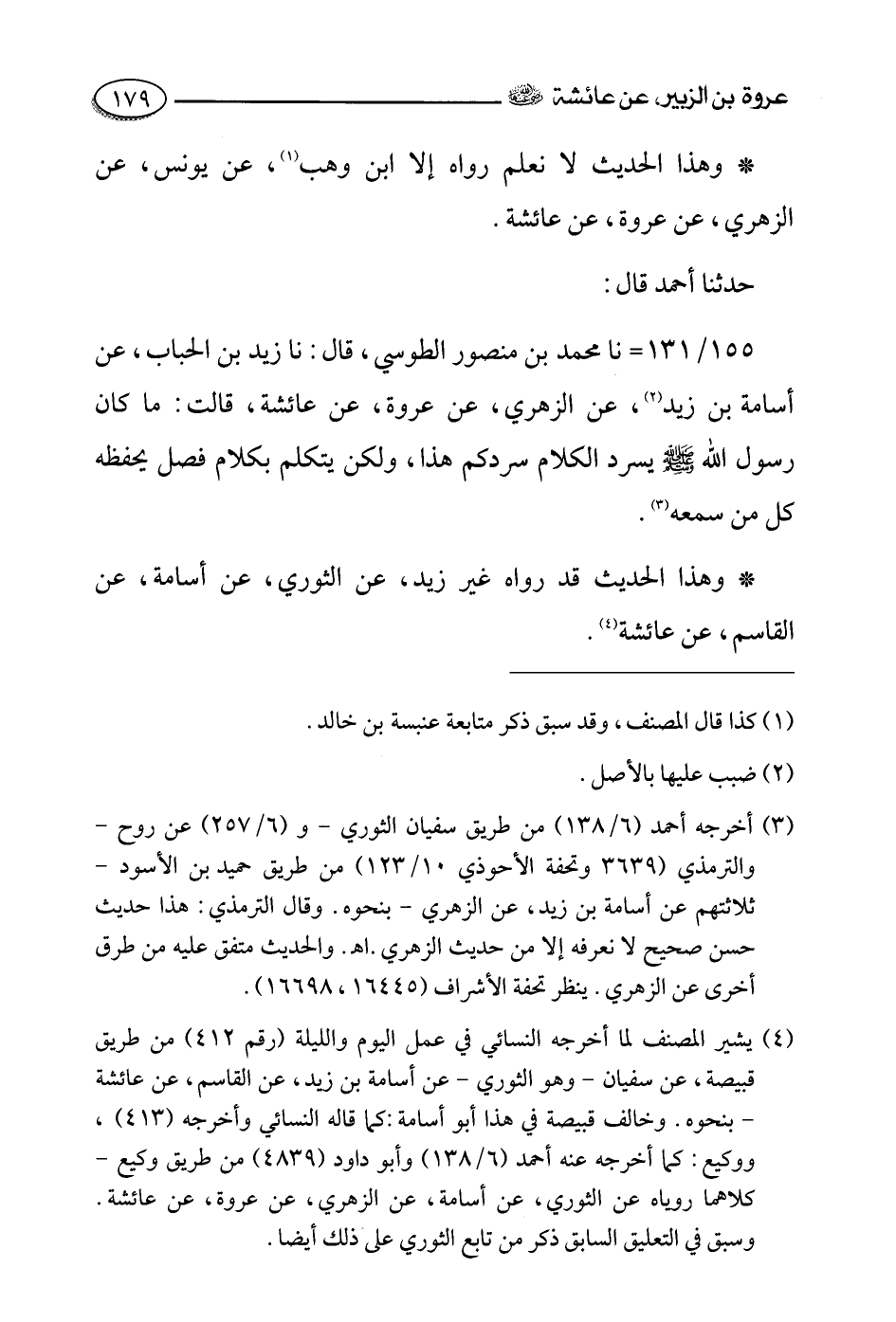 155- حدثنا محمد بن منصور الطوسي، قالَ: حَدَّثَنا زيد بن الحباب , عن أسامة بن زيد , عن الزهري , عن عروة , عن عائشة رضي الله عنها قالت: مَا كَانَ رَسُولُ اللَّهِ صَلَّى اللَّهُ عَلَيْهِ وسلم يسرد الكلام سردكم هذا ولكن يتكلم بكلام فصل يحفظه كل من سمعه.