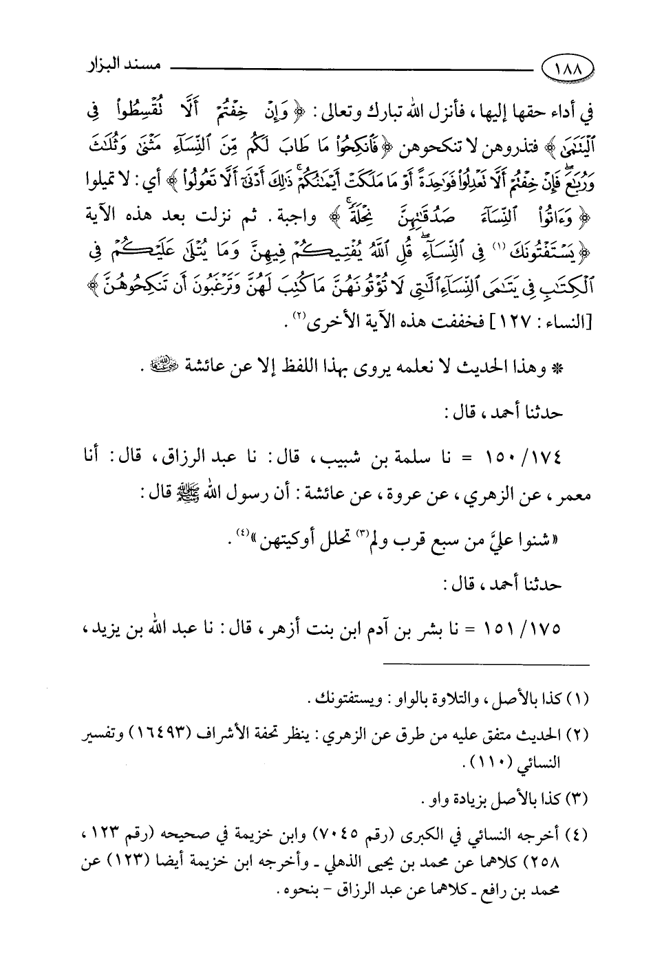 174- حدثنا سلمة بن شبيب، قالَ: حَدَّثَنا عبد الرزاق قال: أخبرنا معمر , عن الزهري , عن عروة , عن عائشة رضي الله عنها أَنَّ رَسُولَ اللَّهِ صَلَّى اللَّهُ عَلَيْهِ وَسَلَّمَ قال: شنوا علي من سبع قرب ولم تحلل أوكيتهن.