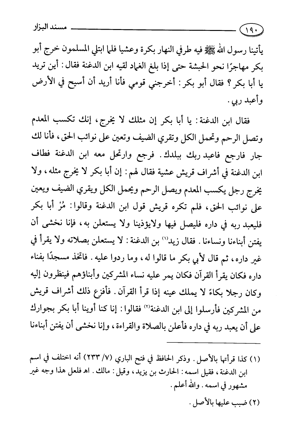 قال ابن شهاب: قال عروة قالت عائشة: فبينما نحن ذات يوم جلوس في بيت أبي بكر نحر الظهيرة إذ قال قائل لأبي بكر هذا رسول الله مقبلا أحسبه قال: وكانت ساعة لم يكن يأتينا فيها فقال أبو بكر: والله ما جاء به في هذه الساعة إلا أمر قالت فَجَاءَ رَسُولُ اللَّهِ صَلَّى اللَّهُ عَلَيْهِ وَسَلَّمَ فاستأذن فأذن له فدخل فقال النبي صلى الله عليه وسلم لأبي بكر: أخرج من عندك". فقال أبو بكر: إنما هم أهلك بأبي أنت يا رسول الله. فقال رسول الله: فإنه قد أذن لي في الخروج". فقال أبو بكر: الصحابة بأبي أنت يا رسول الله؟ فقال رسول الله: نعم". فقال أبو بكر: فخذ بأبي أنت يا رسول الله أحد راحلتي قَالَ رَسُولُ اللَّهِ صَلَّى اللَّهُ عَلَيْهِ وَسَلَّمَ: بالثمن".