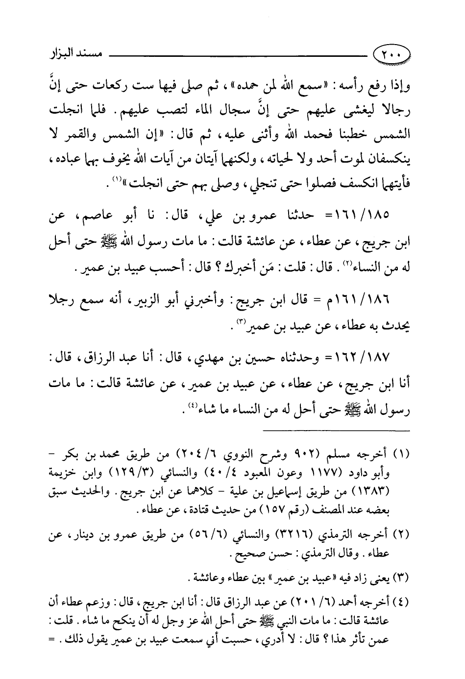 185- حدثنا عمرو بن علي، قالَ: حَدَّثَنا أَبُو عَاصِمٍ , عَنِ ابْنِ جُرَيْجٍ , عَنْ عَطَاءٍ , عن عائشة رضي الله عنها قالت: ما مات رَسُولِ اللَّهِ صَلَّى اللَّهُ عَلَيْهِ وَسَلَّمَ حَتَّى أحل له من النساء قال: قلت من أخبرك؟ قال: أحسب عبيد بن عمير.