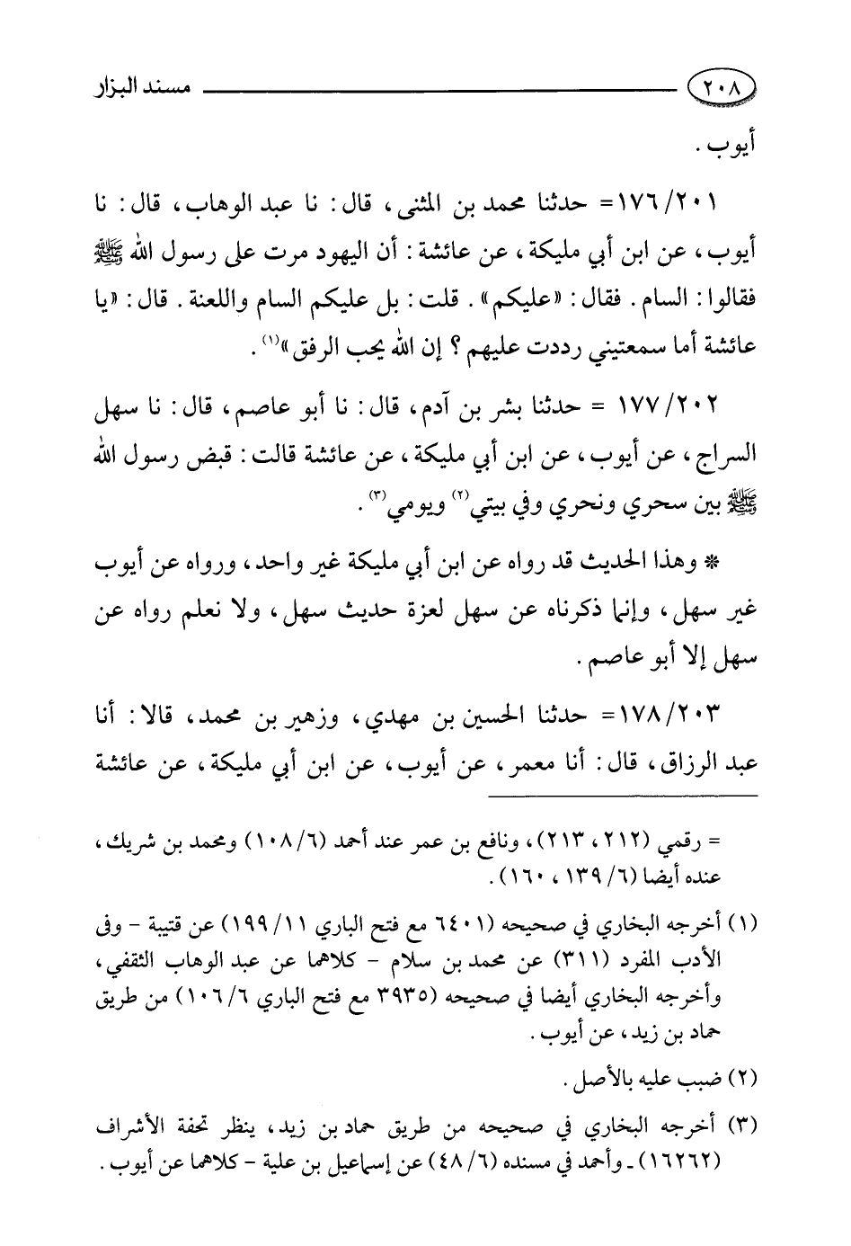 201- حدثنا محمد بن المثنى، قالَ: حَدَّثَنا عبد الوهاب، قالَ: حَدَّثَنا أيوب , عن ابن أبي مليكة , عن عائشة رضي الله عنها أن اليهود مرت عَلَى رَسُولِ اللَّهِ صَلَّى اللَّهُ عَلَيْهِ وَسَلَّمَ فقالوا السام. فقال: عليكم".قلت: بل عليكم السام واللعنة قال: يا عائشة أما سمعتيني رددت عليهم؟ إن الله يحب الرفق.
