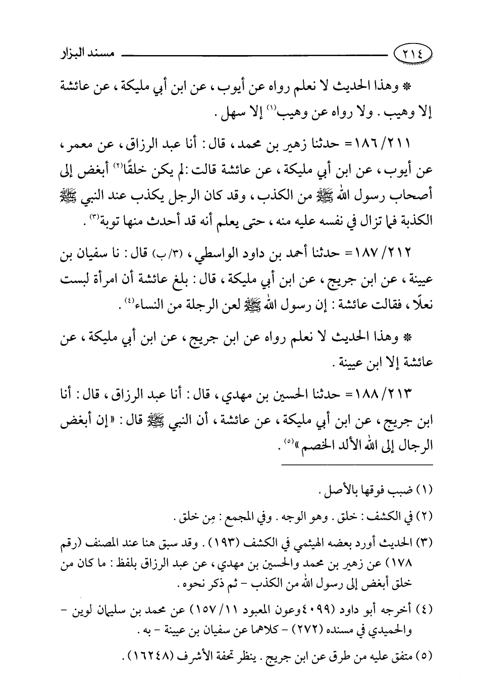 213- حدثنا الحسين بن مهدي قال: أخبرنا عبد الرزاق قال: أخبرنا ابن جريج , عن , عن ابن أبي مليكة , عن عائشة رضي الله عنها أَنَّ النَّبِيَّ صَلَّى اللَّهُ عَلَيْهِ وَسَلَّمَ قَالَ: إن أبغض الرجال إلى الله الألد الخصم".