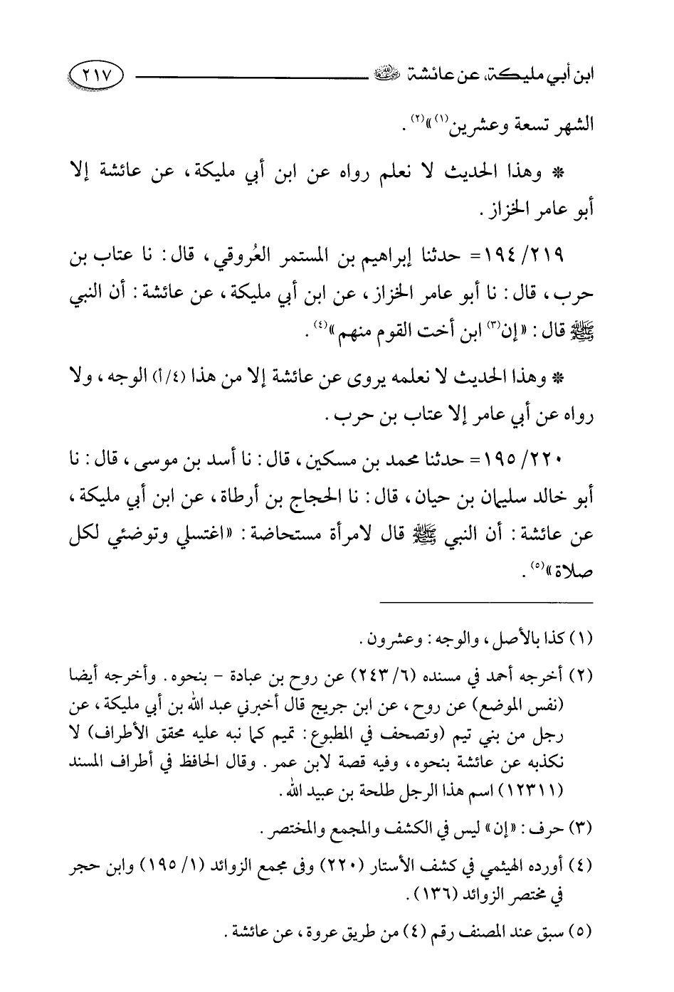 220- حدثنا محمد بن مسكين، قالَ: حَدَّثَنا أسد بن موسى، قالَ: حَدَّثَنا أبو خالد سليمان بن حيان، قالَ: حَدَّثَنا الحجاج بن أرطأة , عن ابن أبي مليكة , عن عائشة رضي الله عنها أَنَّ النَّبِيَّ صَلَّى اللَّهُ عَلَيْهِ وَسَلَّمَ قَالَ لامرأة مستحاضة: اغتسلي وتوضئي لكل صلاة".