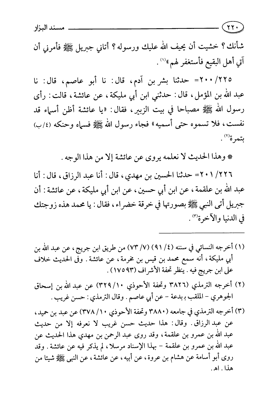 226- حَدَّثَنَا الْحُسَيْنُ بْنُ مهدي قال: أخبرنا عبد الرزاق قال: أخبرنا عبد الله بن علقمة , عن ابن أبي حسين , عن ابن أبي مليكة , عن عائشة رضي الله عنها أن جبريل أتى النبي صلى الله عليه وسلم بصورتها في خرقة خضراء فقال يا محمد هذه زوجتك في الدنيا والآخرة.