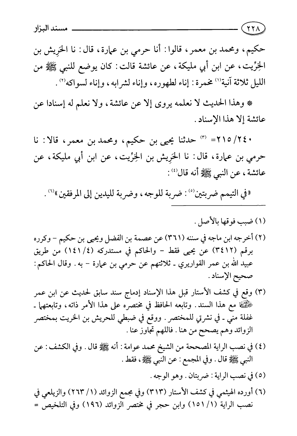 240- حدثنا يحيى بن حكيم ومحمد بن معمر، قالاَ: حَدَّثَنا حرمي بن عمارة، قالَ: حَدَّثَنا الحريش بن الخريت , عن ابن أبي مليكة , عن عائشة رضي الله عنها , عَنِ النَّبِيِّ صَلَّى اللَّهُ عَلَيْهِ وَسَلَّمَ أَنَّهُ قال: في التيمم ضربتين ضربة للوجه وضربة لليدين إلى المرفقين.