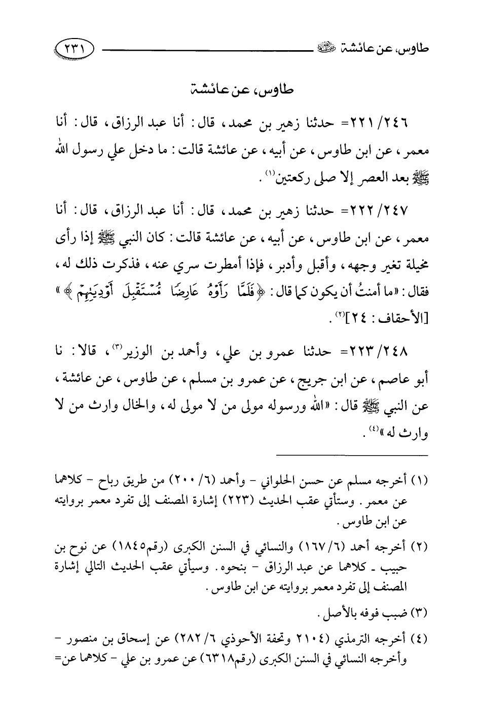 246- حدثنا زهير بن محمد قال: أخبرنا عبد الرزاق قال: أخبرنا مَعْمَرٌ , عَنِ ابْنِ طَاوُسٍ , عَنْ أَبِيهِ , عَنِ عائشة رضي الله عنها قالت: ما دَخَلَ عَلَى رَسُولِ اللَّهِ صَلَّى اللَّهُ عَلَيْهِ وسلم بعد العصر إلا صلى ركعتين.