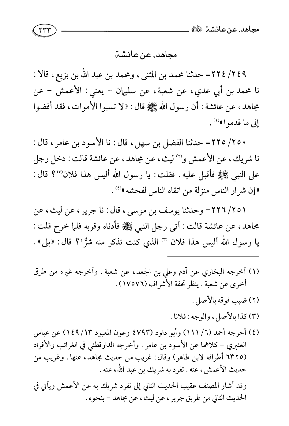 249- حدثنا محمد بن المثنى ومحمد بن عبد الله بن بزيع، قالاَ: حَدَّثَنا محمد بن أبي عدي , عن شعبة , عن سليمان يعني الأعمش , عن مجاهد , عن عائشة رضي الله عنها أَنَّ رَسُولَ اللَّهِ صَلَّى اللَّهُ عَلَيْهِ وَسَلَّمَ قال: لا تسبوا الأموات فقد أفضوا إلى ما قدموا.