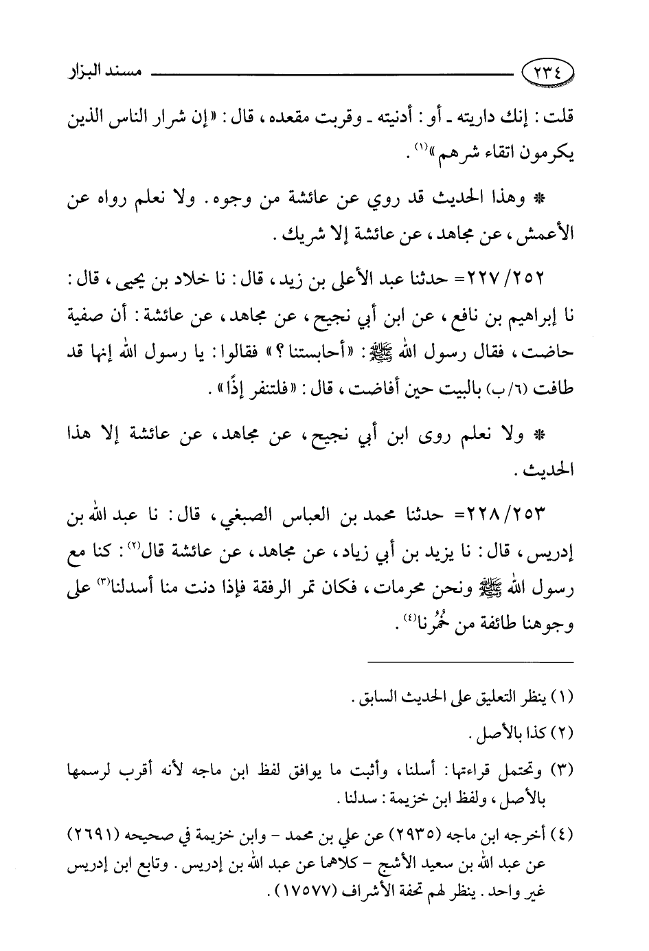 252- حدثنا عبد الأعلى بن زيد، قالَ: حَدَّثَنا خلاد بن يحيى، قالَ: حَدَّثَنا إبراهيم بن نافع , عَنِ ابْنِ أَبِي نَجِيحٍ , عَنْ مُجَاهِدٍ , عَنِ عائشة رضي الله عنها أن صفية حاضت فَقَالَ رَسُولُ اللَّهِ صَلَّى اللَّهُ عَلَيْهِ وَسَلَّمَ: أحابستنا؟ "فقالوا: يا رسول الله إنها قد طافت بالبيت حين أفاضت قال: فلتنفر إذا.