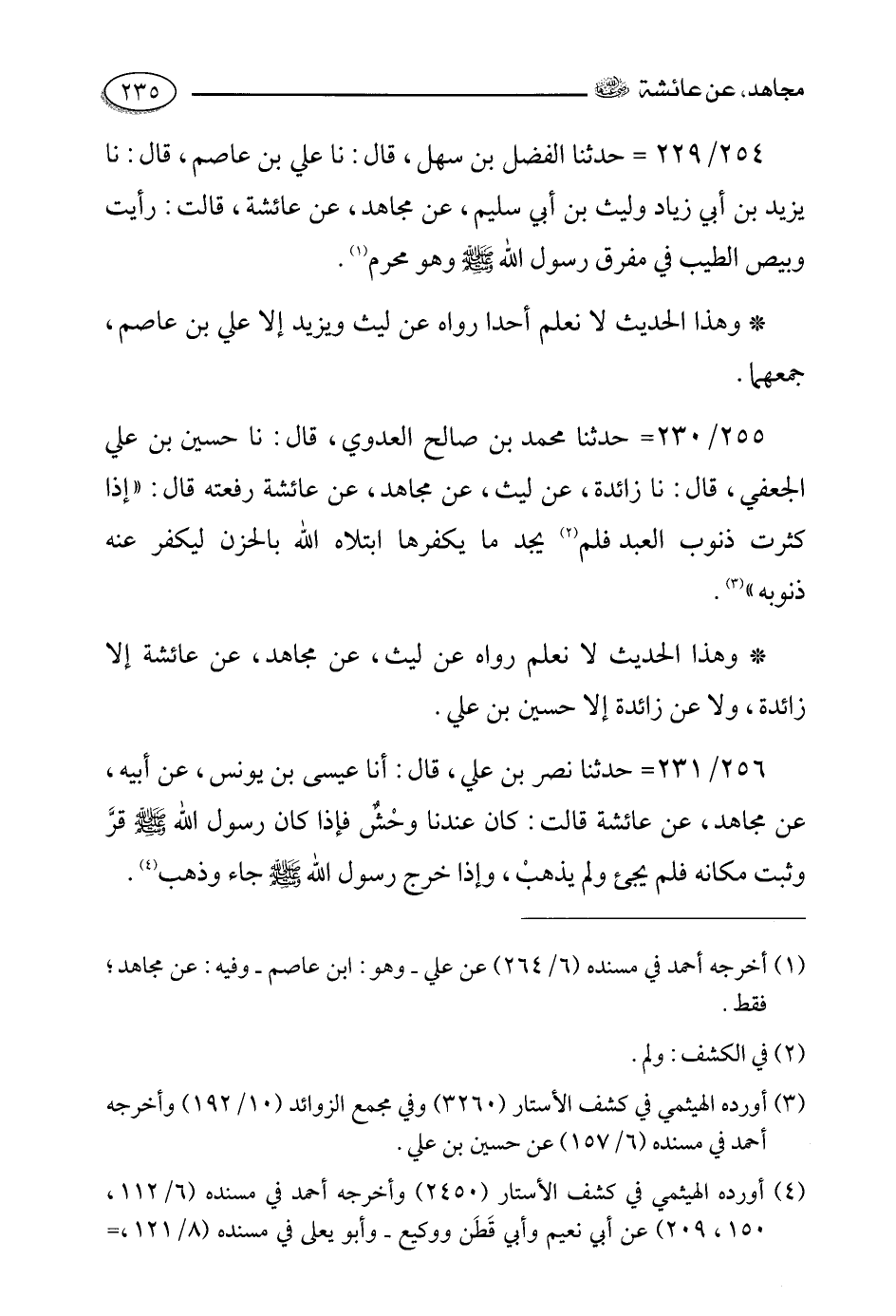 254- حدثنا الفضل بن سهل، قالَ: حَدَّثَنا علي بن عاصم، قالَ: حَدَّثَنا يزيد بن أبي زياد وليث بن أبي سليم , عن مجاهد , عن عائشة رضي الله عنها قالت: رأيت وبيص الطيب في مفرق رَسُولُ اللَّهِ صَلَّى اللَّهُ عَلَيْهِ وَسَلَّمَ وَهُوَ محرم.
