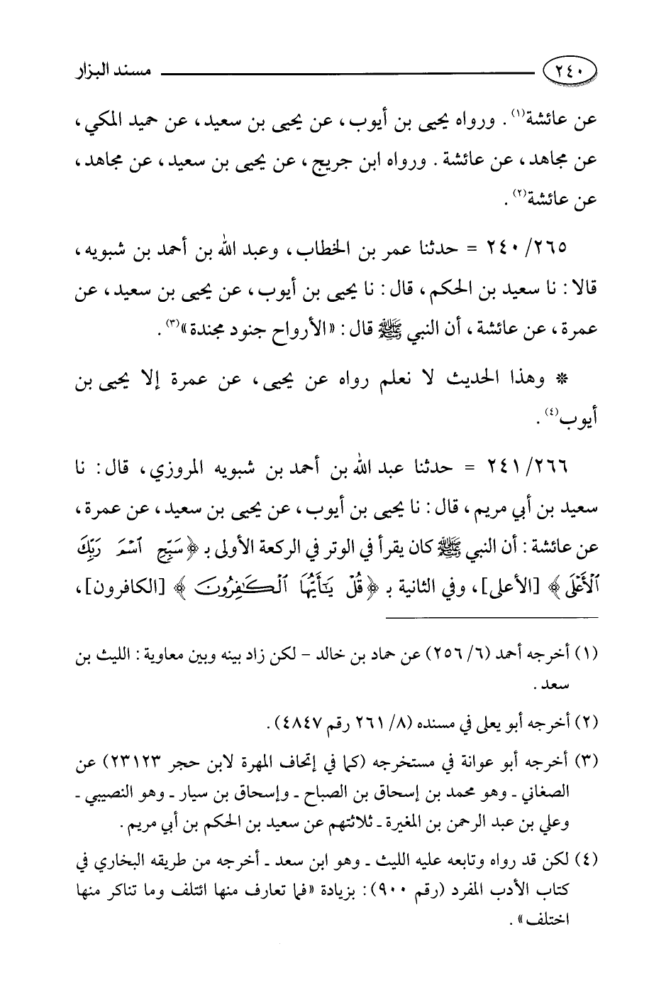 265- حدثنا عمر بن الخطاب وعبد الله بن أحمد بن شبويه، قالاَ: حَدَّثَنا سعيد بن الحكم، قالَ: حَدَّثَنا يحيى بن أيوب , عن يحيى بن سعيد , عن عمرة , عن عائشة رضي الله عنها أَنَّ النَّبِيَّ صَلَّى اللَّهُ عَلَيْهِ وَسَلَّمَ قَالَ: الأرواح جنود مجندة.