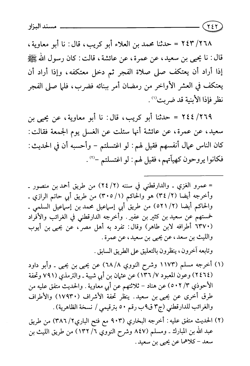 268- حدثنا محمد بن العلاء أبو كريب، قالَ: حَدَّثَنا أبو معاوية، قالَ: حَدَّثَنا يحيى بن سعيد , عن عمرة , عن عائشة رضي الله عنها قالت: كَانَ رَسُولُ اللَّهِ صَلَّى اللَّهُ عَلَيْهِ وَسَلَّمَ إذا أراد أن يعتكف صلى صلاة الفجر ثم دخل معتكفه وإذا أراد أن يعتكف في العشر الأواخر من رمضان أمر ببنائه فضرب فلما صلى الفجر نظر فإذا الأبنية قد ضربت.