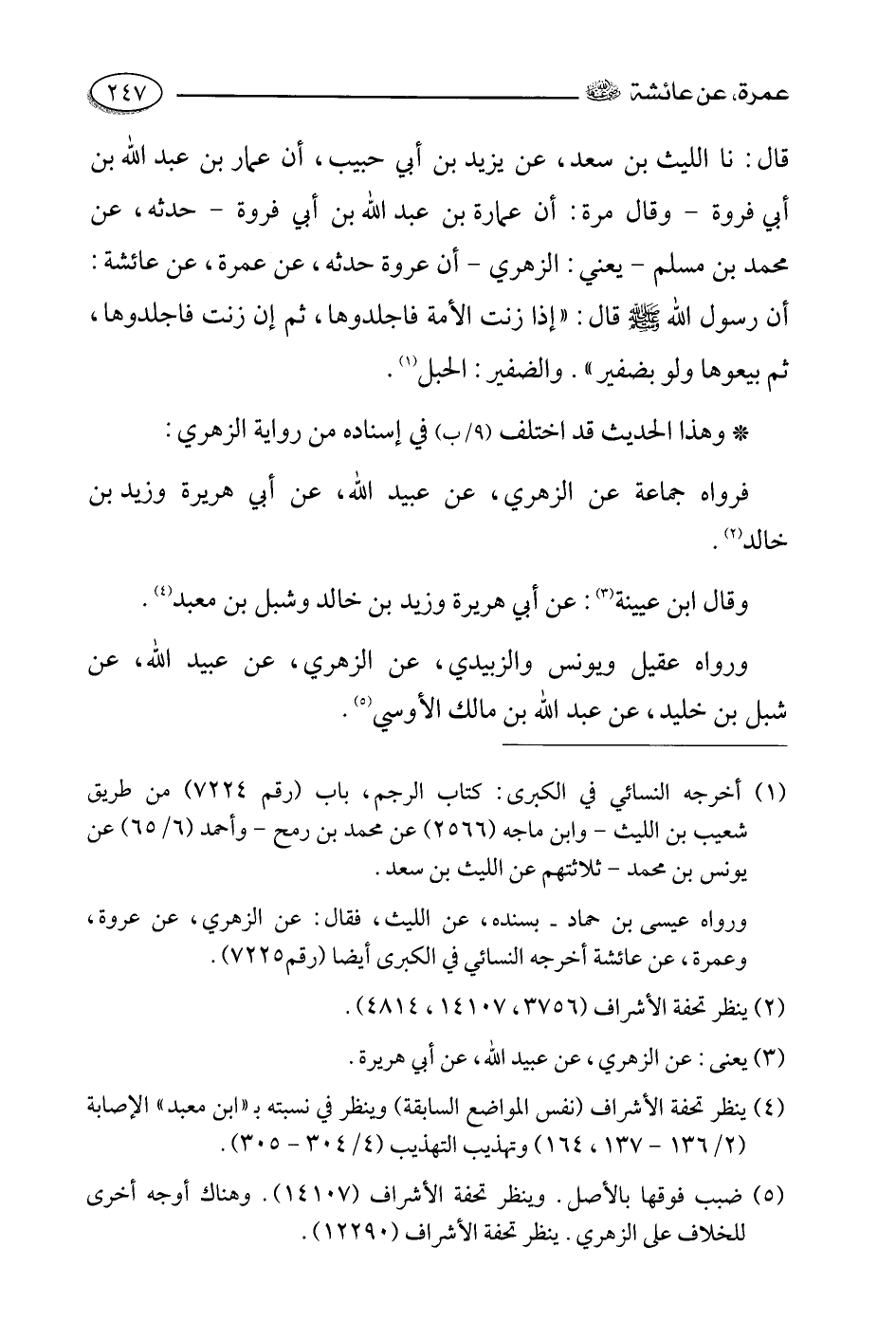 279- حدثنا إبراهيم بن زياد الصائغ، قالَ: حَدَّثَنا شبابة بن سوار، قالَ: حَدَّثَنا الليث بن سعد , عن يزيد بن أبي حبيب أن عمار بن عبد الله بن أبي فروة وقال مرة أن عمارة بن عبد الله بن أبي فروة حدثه , عن محمد بن مسلم يعني الزهري أن عروة حدثه , عن عمرة , عن عائشة رضي الله عنها: أَنَّ رَسُولَ اللَّهِ صَلَّى اللَّهُ عَلَيْهِ وَسَلَّمَ قال: إذا زنت الأمة فاجلدوها ثم إن زنت فاجلدوها ثم بيعوها ولو بضفير "والضفير الحبل.