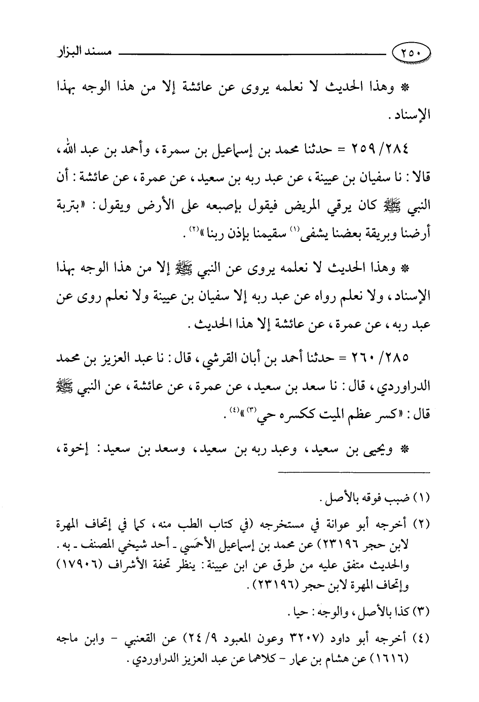 284- حدثنا محمد بن إسماعيل بن سمرة وأحمد بن عبد الله، قالاَ: حَدَّثَنا سفيان بن عيينة , عن عبد ربه بن سعيد , عن عمرة , عن عائشة رضي الله عنها أَنَّ النَّبِيَّ صَلَّى اللَّهُ عَلَيْهِ وَسَلَّمَ كَانَ يرقي المريض فيقول بإصبعه على الأرض ويقول: بتربة أرضنا وبريقة بعضنا يشفى سقيمنا بإذن ربنا.