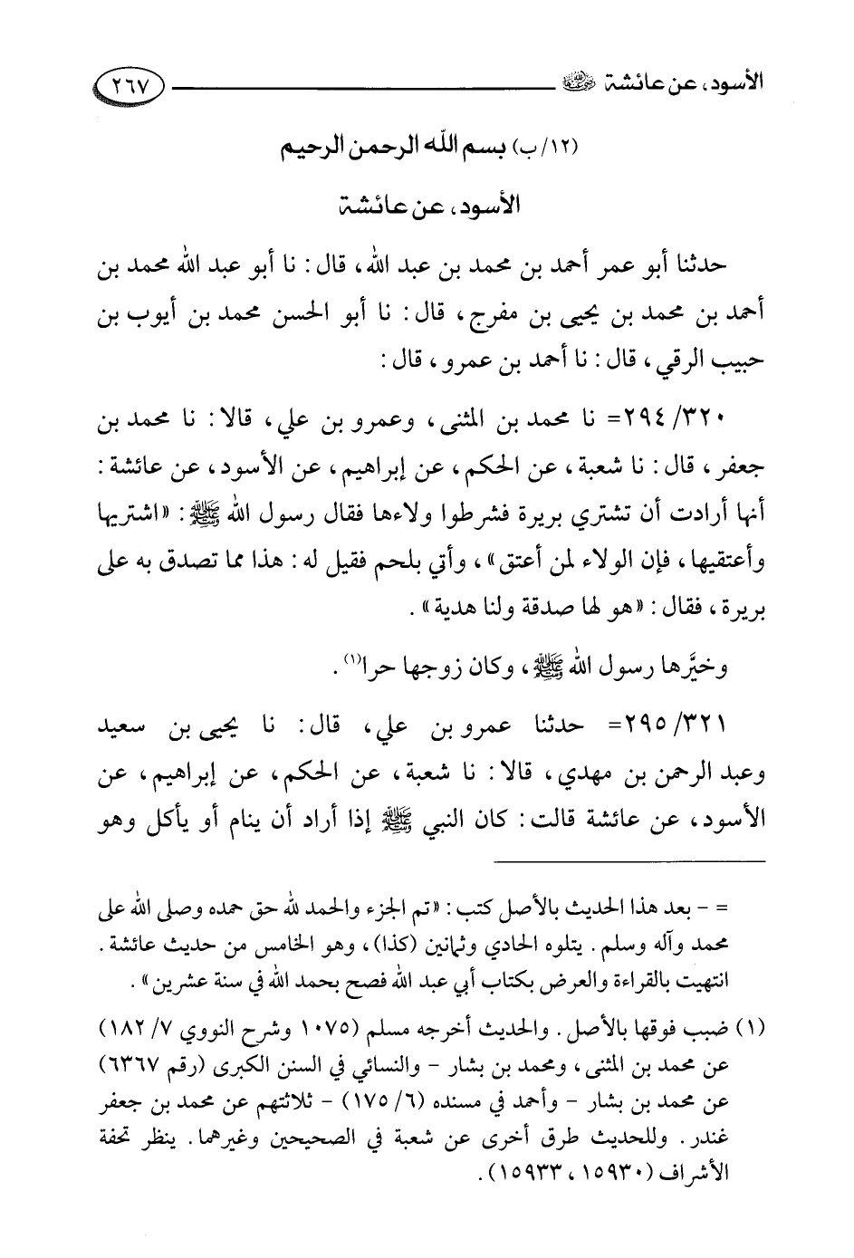 320- حَدَّثَنَا مُحَمَّدُ بْنُ الْمُثَنَّى وَعَمْرُو بْنُ عَلِيٍّ، قالاَ: حَدَّثَنا محمد بن جعفر، قالَ: حَدَّثَنا شعبة , عن الحكم , عن إبراهيم , عن الأسود , عن عائشة رضي الله عنها أنها أرادت أن تستري بريرة فشرطوا ولاءها فَقَالَ رَسُولُ اللَّهِ صَلَّى اللَّهُ عَلَيْهِ وَسَلَّمَ: اشتريها وأعتقيها فإن الولاء لمن أعتق". وأتي بلحم فقيل له هذا مما تصدق به على بريرة فقال: هو لها صدقة ولنا هدية.