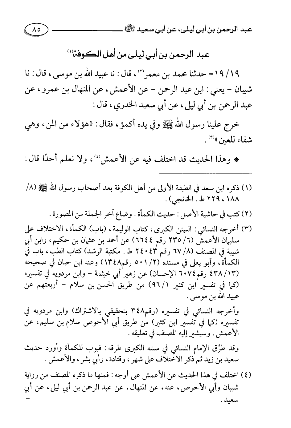 19- حَدَّثَنَا مُحَمَّدُ بْنُ مَعْمَرٍ، قالَ: حَدَّثَنا عبيد الله بن موسى، قالَ: حَدَّثَنا شيبان يعني ابن عبد الرحمن , عن الأعمش , عن المنهال بن عمرو , عَنْ عَبْدِ الرَّحْمَنِ بْنِ أَبِي لَيْلَى , عَنْ أبي سعيد الخدري قَالَ: خَرَجَ عَلَيْنَا رَسُولُ اللَّهِ صَلَّى اللَّهُ عليه وسلم وفي يده أكمؤ فقال: هؤلاء من المن وهي شفاء للعين.
