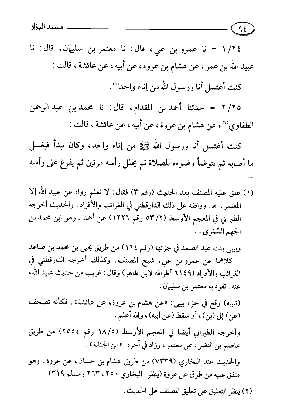 24- حدثنا عمرو بن علي، قالَ: حَدَّثَنا معتمر بن سليمان، قالَ: حَدَّثَنا عبيد الله بن عمر , عن هشام بن عروة , عن أبيه , عن عائشة رضي الله عنها قالت: كنت أغتسل أنا ورسول اللَّهِ صَلَّى اللَّهُ عَلَيْهِ وَسَلَّمَ مِنْ إِنَاءٍ واحد.