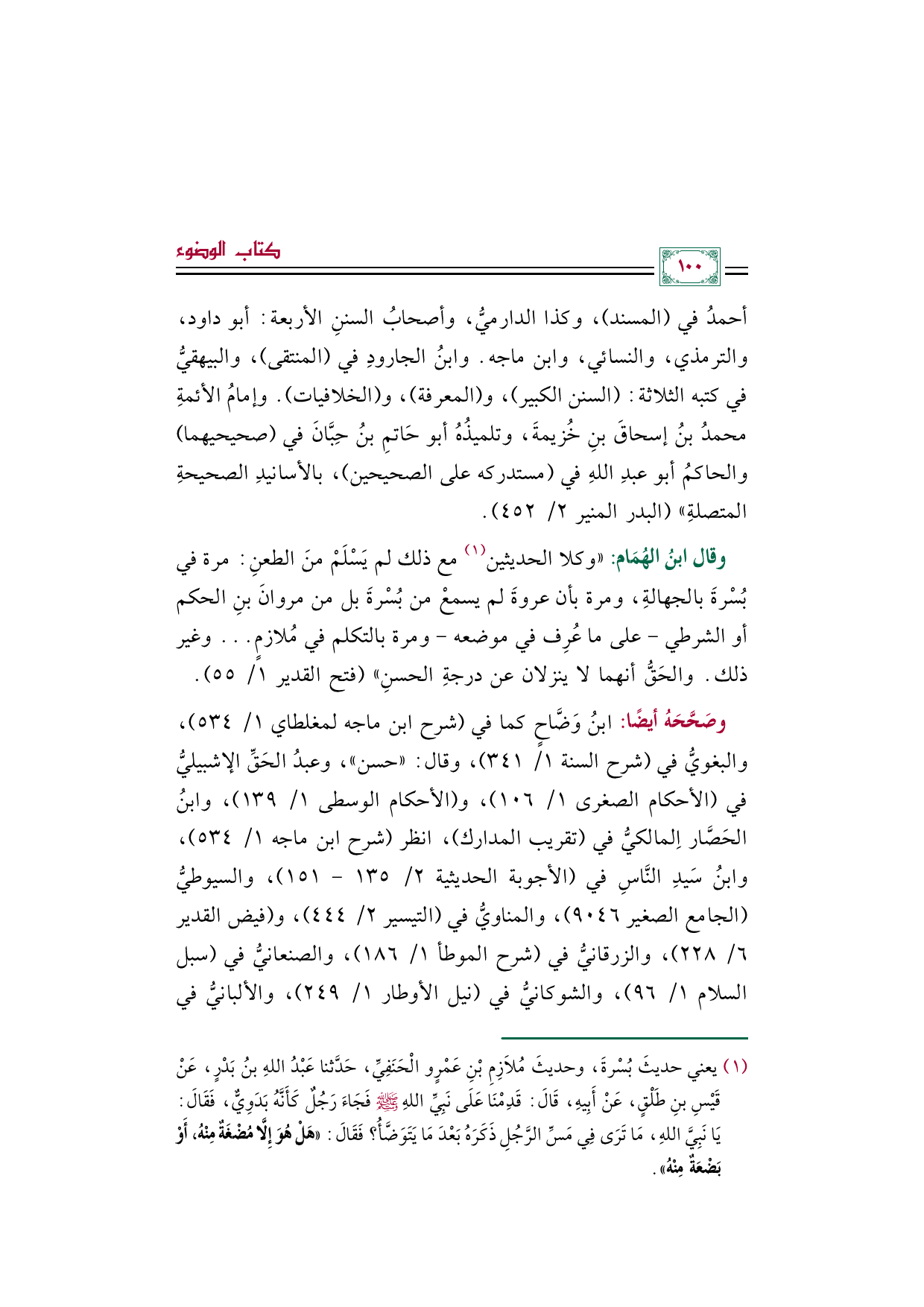 وقال ابنُ الهُمَام: ((وكلا الحديثين (¬١) مع ذلك لم يَسْلَمْ منَ الطعنِ: مرة في بُسْرةَ بالجهالةِ، ومرة بأن عروةَ لم يسمعْ من بُسْرةَ بل من مروانَ بنِ الحكم أو الشرطي-على ما عُرِف في موضعه- ومرة بالتكلم في مُلازمٍ ... وغير ذلك. والحَقُّ أنهما لا ينزلان عن درجةِ الحسنِ)) (فتح القدير ١/ ٥٥).