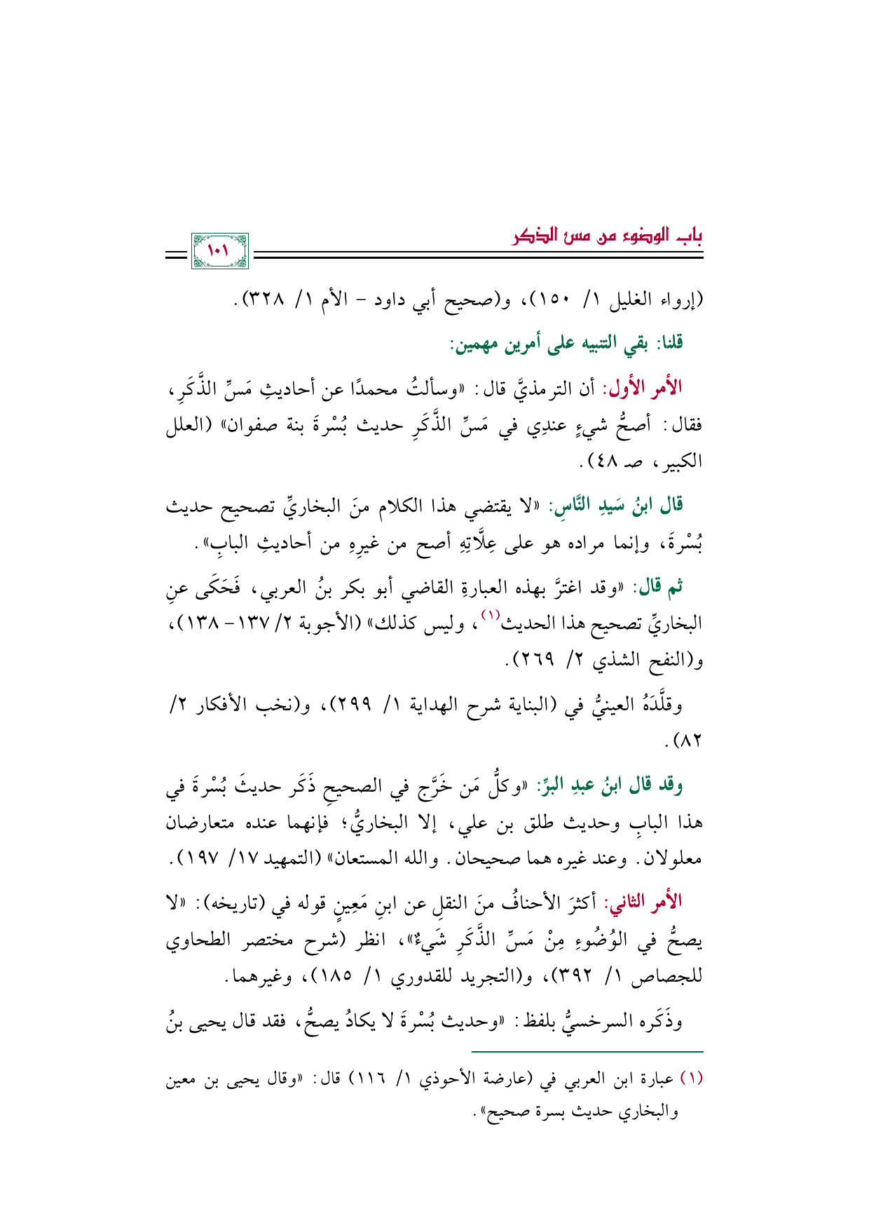 الأمر الأول: أن الترمذيَّ قال: ((وسألتُ محمدًا عن أحاديثِ مَسِّ الذَّكَرِ، فقال: أصحُّ شيءٍ عندِي في مَسِّ الذَّكَرِ حديث بُسْرةَ بنة صفوان)) (العلل الكبير، صـ ٤٨).
