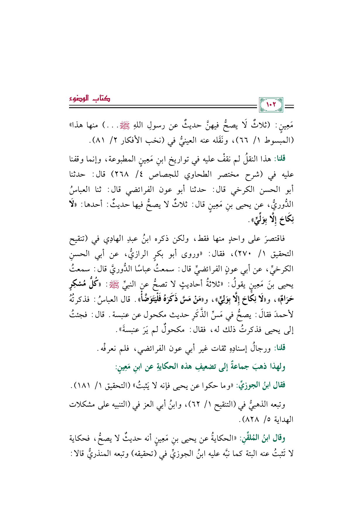 فاقتصرَ على واحدٍ منها فقط، ولكن ذكره ابنُ عبدِ الهادِي في (تنقيح التحقيق ١/ ٢٧٠)، فقال: ((وروى أبو بكرٍ الرازيُّ، عن أبي الحسنِ الكرخيِّ، عن أبي عونٍ الفرائضيِّ قال: سمعتُ عباسًا الدُّوريَّ قال: سمعتُ يحيى بنَ مَعِينٍ يقولُ: ((ثلاثةُ أحاديثٍ لا تصحُّ عن النبيِّ صلى الله عليه وسلم: ((كُلُّ مُسْكِرٍ حَرَامٌ))، و ((لَا نِكَاحَ إِلَّا بِوَلِيٍّ))، و ((مَنْ مَسَّ ذَكَرَهُ فَلْيَتَوَضَّأْ)). قال العباسُ: فذكرتُهُ لأحمدَ فقالَ: يصحُّ في مَسِّ الذَّكَرِ حديث مكحول عن عنبسة. قال: فجئتُ إلى يحيى فذكرتُ ذلك له، فقال: مكحولٌ لم يَرَ عنبسةَ)).