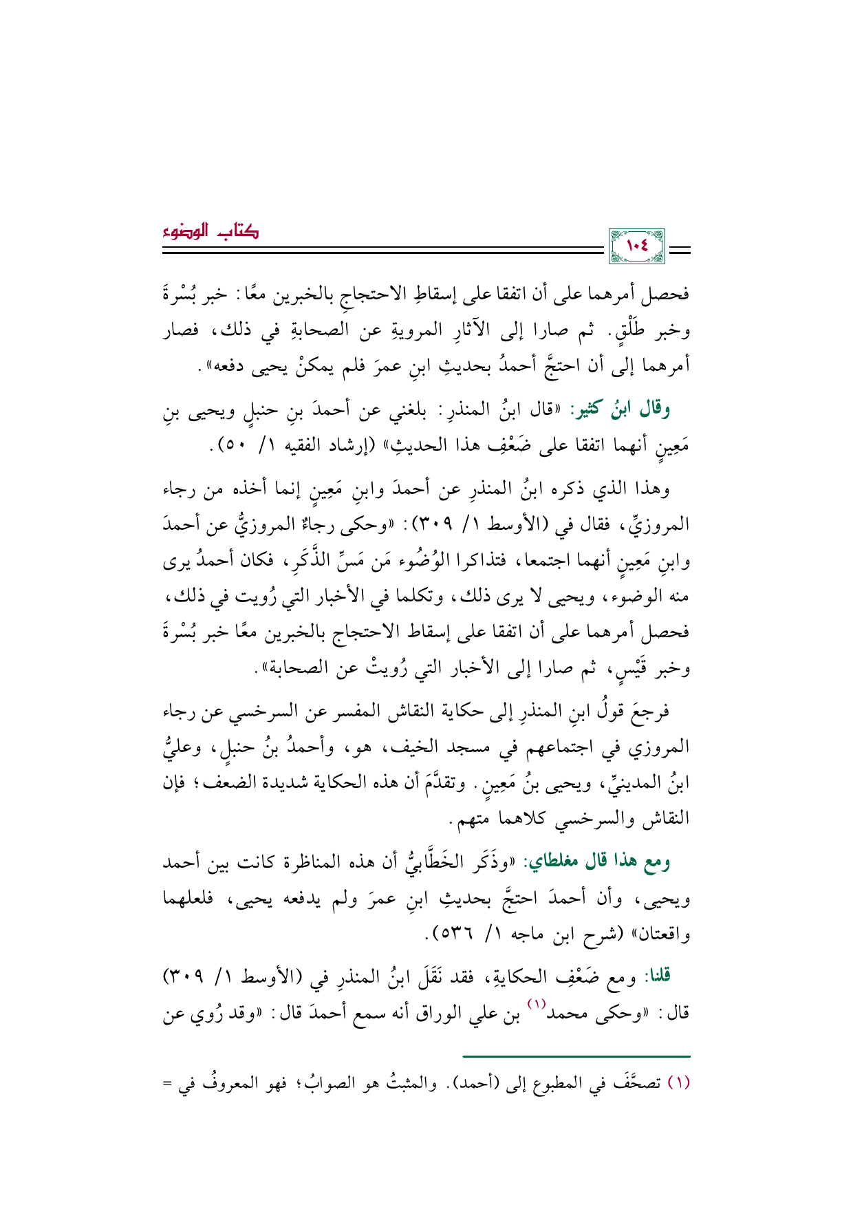 وهذا الذي ذكره ابنُ المنذرِ عن أحمدَ وابنِ مَعِينٍ إنما أخذه من رجاء المروزيِّ، فقال في (الأوسط ١/ ٣٠٩): ((وحكى رجاءٌ المروزيُّ عن أحمدَ وابنِ مَعِينٍ أنهما اجتمعا، فتذاكرا الوُضُوءَ من مَسِّ الذَّكَرِ، فكان أحمدُ يرى منه الوضوء، ويحيى لا يرى ذلك، وتكلما في الأخبار التي رُويت في ذلك، فحصل أمرهما على أن اتفقا على إسقاط الاحتجاج بالخبرين معًا خبر بُسْرةَ وخبر قَيْسٍ، ثم صارا إلى الأخبار التي رُويتْ عن الصحابة)).