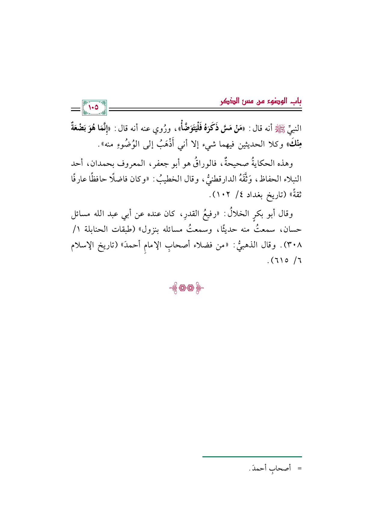 النبيِّ صلى الله عليه وسلم أنه قال: ((مَنْ مَسَّ ذَكَرَهُ فَلْيَتَوَضَّأْ))، ورُوي عنه أنه قال: ((إِنَّمَا هُوَ بَضْعَةٌ مِنْكَ)) وكلا الحديثين فيهما شيء إلا أني أَذْهَبُ إلى الوُضُوءِ منه)).