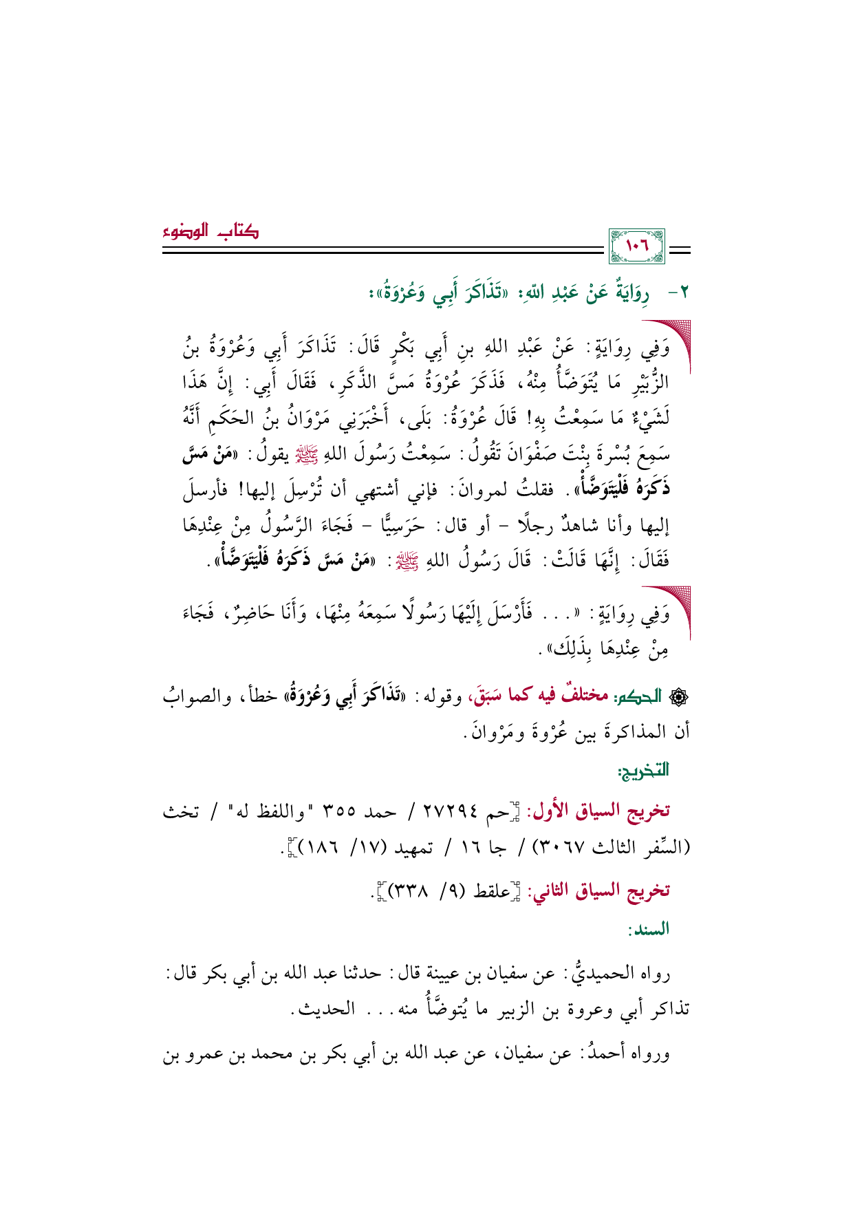 رواه الحميديُّ: عن سفيان بن عيينة قال: حدثنا عبد الله بن أبي بكر قال: تذاكر أبي وعروة بن الزبير ما يُتوضَّأُ منه ... الحديث.