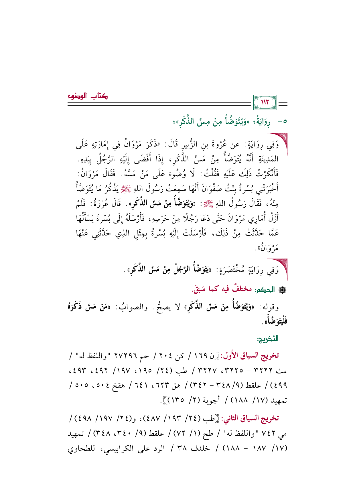 • وَفِي رِوَايَةٍ: عن عُرْوةَ بنِ الزُّبيرِ قَالَ: ((ذَكَرَ مَرْوَانُ فِي إِمَارَتِهِ عَلَى المَدِينَةِ أَنَّهُ يُتَوَضَّأُ مِنْ مَسِّ الذَّكَرِ، إِذَا أَفْضَى إِلَيْهِ الرَّجُلُ بِيَدِهِ. فَأَنْكَرْتُ ذَلِكَ عَلَيْهِ فَقُلْتُ: لَا وُضُوءَ عَلَى مَنْ مَسَّهُ. فَقَالَ مَرْوَانُ: أَخْبَرَتْنِي بُسْرةُ بِنْتُ صَفْوَانَ أَنَّهَا سَمِعَتْ رَسُولَ اللهِ صلى الله عليه وسلم يَذْكُرُ مَا يُتَوَضَّأُ مِنْهُ، فَقَالَ رَسُولُ اللهِ صلى الله عليه وسلم: ((وَيُتَوَضَّأُ مِنْ مَسِّ الذَّكَرِ)). قَالَ عُرْوَةُ: فَلَمْ أَزَلْ أُمَارِي مَرْوَانَ حَتَّى دَعَا رَجُلًا مِنْ حَرَسِهِ، فَأَرْسَلَهُ إِلَى بُسْرةَ يَسْأَلُهَا عَمَّا حَدَّثَتْ مِنْ ذَلِكَ، فَأَرْسَلَتْ إِلَيْهِ بُسْرةُ بِمِثْلِ الذِي حَدَّثَنِي عَنْهَا مَرْوَانُ)).