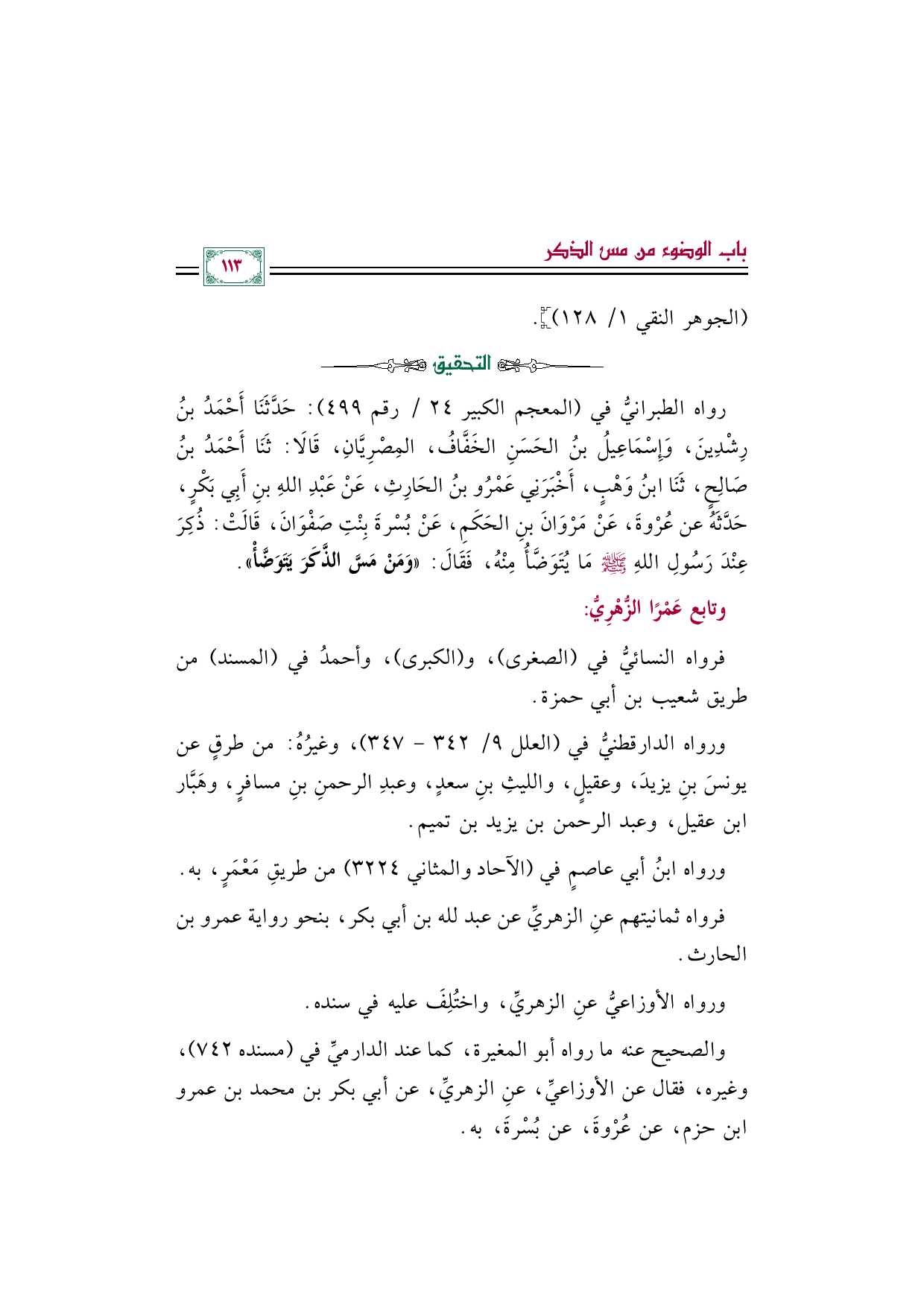 رواه الطبرانيُّ في (المعجم الكبير ٢٤/ رقم ٤٩٩): حَدَّثَنَا أَحْمَدُ بنُ رِشْدِينَ، وَإِسْمَاعِيلُ بنُ الحَسَنِ الخَفَّافُ، المِصْرِيَّانِ، قَالَا: ثَنَا أَحْمَدُ بنُ صَالِحٍ، ثَنَا ابنُ وَهْبٍ، أَخْبَرَنِي عَمْرُو بنُ الحَارِثِ، عَنْ عَبْدِ اللهِ بنِ أَبِي بَكْرٍ، حَدَّثَهُ عن عُرْوةَ، عَنْ مَرْوَانَ بنِ الحَكَمِ، عَنْ بُسْرةَ بِنْتِ صَفْوَانَ، قَالَتْ: ذُكِرَ عِنْدَ رَسُولِ اللهِ صلى الله عليه وسلم مَا يُتَوَضَّأُ مِنْهُ، فَقَالَ: ((وَمَنْ مَسَّ الذَّكَرَ يَتَوَضَّأْ)).