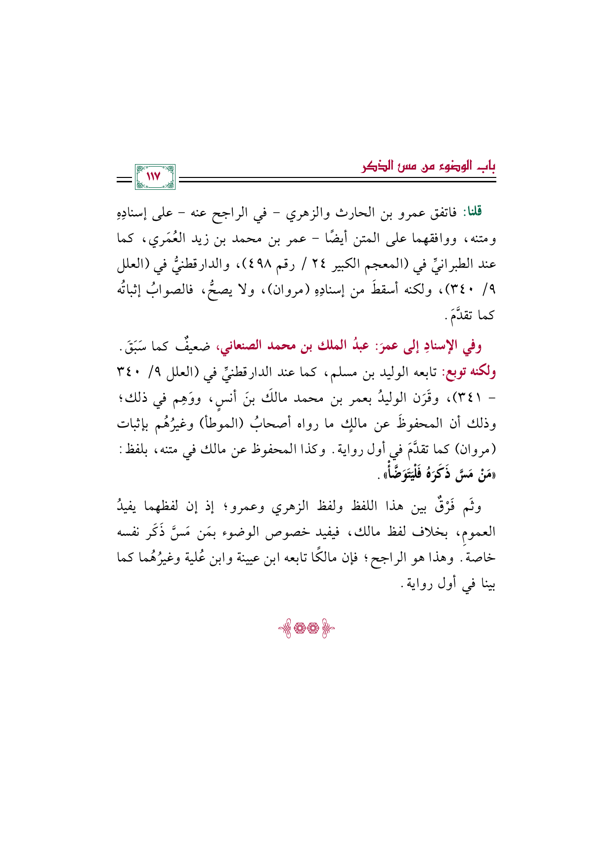 وفي الإسنادِ إلى عمرَ: عبدُ الملك بن محمد الصنعاني، ضعيفٌ كما سَبَقَ. ولكنه توبع: تابعه الوليد بن مسلم، كما عند الدارقطنيِّ في (العلل ٩/ ٣٤٠ - ٣٤١)، وقَرَن الوليدُ بعمر بن محمد مالكَ بنَ أنسٍ، ووَهِم في ذلك؛ وذلك أن المحفوظَ عن مالكٍ ما رواه أصحابُ (الموطأ) وغيرُهُم بإثبات (مروان) كما تقدَّمَ في أول رواية. وكذا المحفوظ عن مالك في متنه، بلفظ: ((مَنْ مَسَّ ذَكَرَهُ فَلْيَتَوَضَّأْ)).