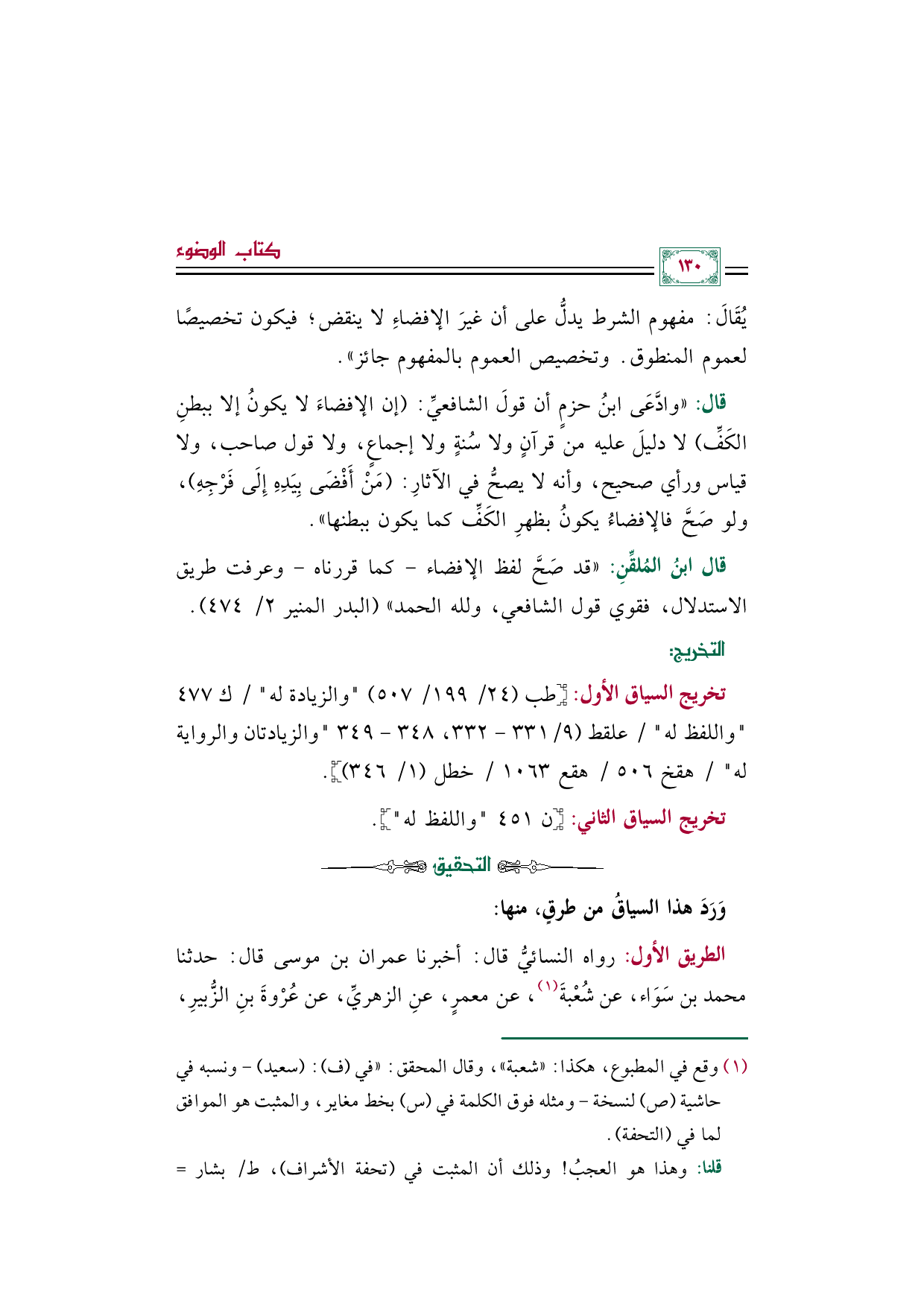 قال: ((وادَّعَى ابنُ حزمٍ أن قولَ الشافعيِّ: (إن الإفضاءَ لا يكونُ إلا ببطنِ الكَفِّ) لا دليلَ عليه من قرآنٍ ولا سُنةٍ ولا إجماعٍ، ولا قول صاحب، ولا قياس ورأي صحيح، وأنه لا يصحُّ في الآثارِ: (مَنْ أَفْضَى بِيَدِهِ إِلَى فَرْجِهِ)، ولو صَحَّ فالإفضاءُ يكونُ بظهرِ الكَفِّ كما يكون ببطنها)).