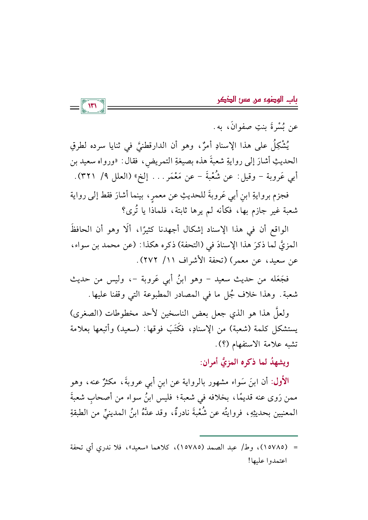 يُشْكِلُ على هذا الإسنادِ أمرٌ، وهو أن الدارقطنيَّ في ثنايا سرده لطرقِ الحديثِ أشارَ إلى روايةِ شعبةَ هذه بصيغةِ التمريضِ، فقال: ((ورواه سعيد بن أبي عَروبة -وقيل: عن شُعْبةَ- عن مَعْمَر ... إلخ)) (العلل ٩/ ٣٢١).