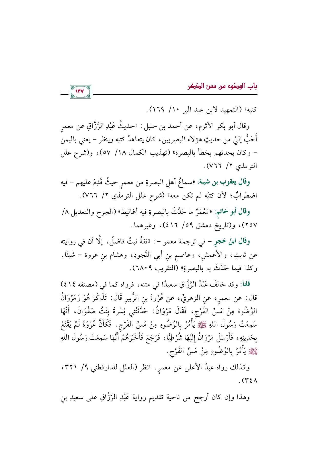 وقال أبو بكر الأثرم، عن أحمد بن حنبل: ((حديثُ عَبْدِ الرَّزَّاقِ عن معمرٍ أَحَبُّ إليَّ من حديثِ هؤلاء البصريين، كان يتعاهدُ كتبه وينظر -يعني باليمن- وكان يحدثهم بخطأ بالبصرة)) (تهذيب الكمال ١٨/ ٥٧)، و (شرح علل الترمذي ٢/ ٧٦٦).