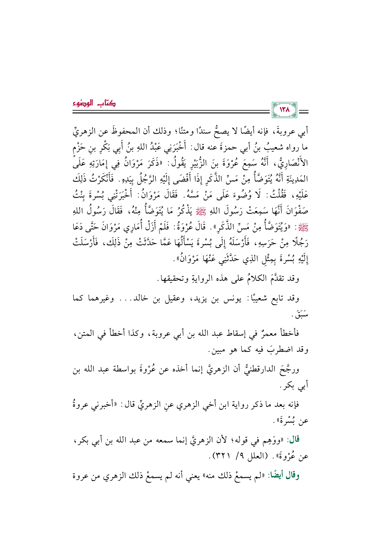 أبي عروبةَ، فإنه أيضًا لا يصحُّ سندًا ومتنًا؛ وذلك أن المحفوظَ عن الزهريِّ ما رواه شعيبُ بنُ أبي حمزةَ عنه قال: أَخْبَرَنِي عَبْدُ اللهِ بنُ أَبِي بَكْرِ بنِ حَزْمٍ الأَنْصَارِيُّ، أَنَّهُ سَمِعَ عُرْوَةَ بنَ الزُّبَيْرِ يَقُولُ: ((ذَكَرَ مَرْوَانُ فِي إِمَارَتِهِ عَلَى المَدِينَةِ أَنَّهُ يُتَوَضَّأُ مِنْ مَسِّ الذَّكَرِ إِذَا أَفْضَى إِلَيْهِ الرَّجُلُ بِيَدِهِ. فَأَنْكَرْتُ ذَلِكَ عَلَيْهِ، فَقُلْتُ: لَا وُضُوءَ عَلَى مَنْ مَسَّهُ. فَقَالَ مَرْوَانُ: أَخْبَرَتْنِي بُسْرةَ بِنْتُ صَفْوَانَ أَنَّهَا سَمِعَتْ رَسُولَ اللهِ صلى الله عليه وسلم يَذْكُرُ مَا يُتَوَضَّأُ مِنْهُ، فَقَالَ رَسُولُ اللهِ صلى الله عليه وسلم: ((وَيُتَوَضَّأُ مِنْ مَسِّ الذَّكَرِ)). قَالَ عُرْوَةُ: فَلَمْ أَزَلْ أُمَارِي مَرْوَانَ حَتَّى دَعَا رَجُلًا مِنْ حَرَسِهِ، فَأَرْسَلَهُ إِلَى بُسْرةَ يَسْأَلُهَا عَمَّا حَدَّثَتْ مِنْ ذَلِكَ، فَأَرْسَلَتْ إِلَيْهِ بُسْرةَ بِمِثْلِ الذِي حَدَّثَنِي عَنْهَا مَرْوَانُ)).