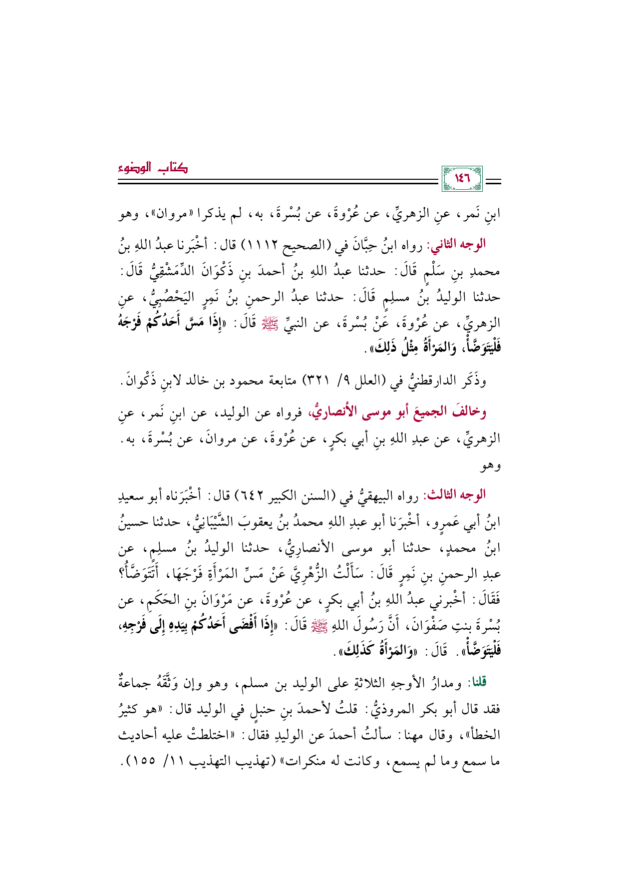 الوجه الثالث: رواه البيهقيُّ في (السنن الكبير ٦٤٢) قال: أخْبَرَناه أبو سعيدِ بنُ أبي عَمرٍو، أخْبرَنا أبو عبدِ اللهِ محمدُ بنُ يعقوبَ الشَّيْبَانِيُّ، حدثنا حسينُ بنُ محمدٍ، حدثنا أبو موسى الأنصارِيُّ، حدثنا الوليدُ بنُ مسلِمٍ، عن عبدِ الرحمنِ بنِ نَمِرٍ قَالَ: سَأَلْتُ الزُّهْرِيَّ عَنْ مَسِّ المَرْأَةِ فَرْجَهَا، أَتَتَوَضَّأُ؟ فَقَالَ: أخْبرني عبدُ اللهِ بنُ أبي بكرٍ، عن عُرْوةَ، عن مَرْوَانَ بنِ الحَكَمِ، عن بُسْرةَ بنتِ صَفْوَانَ، أَنَّ رَسُولَ اللهِ صلى الله عليه وسلم قَالَ: ((إِذَا أَفْضَى أَحَدُكُمْ بِيَدِهِ إِلَى فَرْجِهِ، فَلْيَتَوَضَّأْ)). قَالَ: ((وَالمَرْأَةُ كَذَلِكَ)).