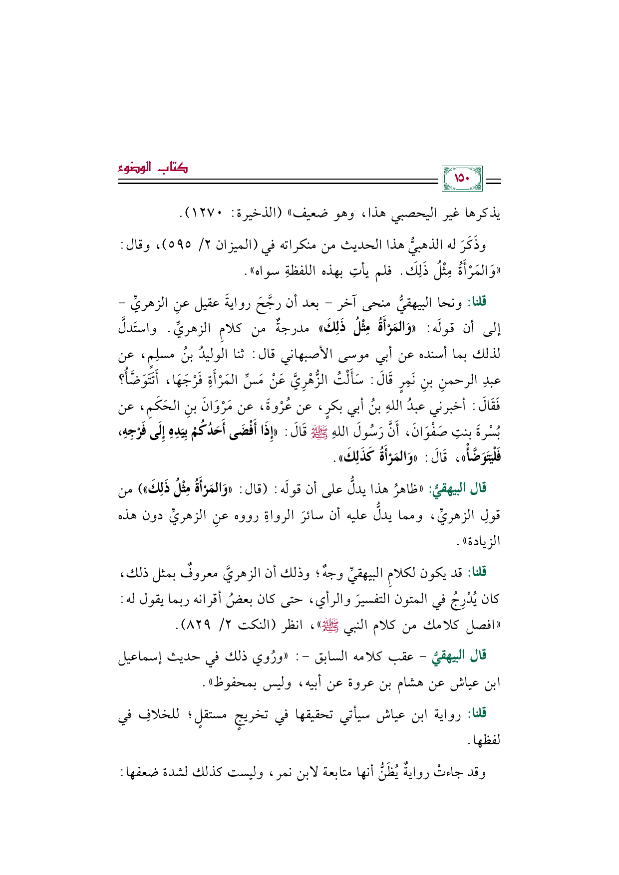 قلنا: ونحا البيهقيُّ منحى آخر -بعد أن رجَّحَ روايةَ عقيل عنِ الزهريِّ- إلى أن قولَه: ((وَالمَرْأَةُ مِثْلُ ذَلِكَ)) مدرجةٌ من كلامِ الزهريِّ. واستَدلَّ لذلك بما أسنده عن أبي موسى الأصبهاني قال: ثنا الوليدُ بنُ مسلِمٍ، عن عبدِ الرحمنِ بنِ نَمِرٍ قَالَ: سَأَلْتُ الزُّهْرِيَّ عَنْ مَسِّ المَرْأَةِ فَرْجَهَا، أَتَتَوَضَّأُ؟ فَقَالَ: أخبرني عبدُ اللهِ بنُ أبي بكرٍ، عن عُرْوةَ، عن مَرْوَانَ بنِ الحَكَمِ، عن بُسْرةَ بنتِ صَفْوَانَ، أَنَّ رَسُولَ اللهِ صلى الله عليه وسلم قَالَ: ((إِذَا أَفْضَى أَحَدُكُمْ بِيَدِهِ إِلَى فَرْجِهِ، فَلْيَتَوَضَّأْ))، قَالَ: ((وَالمَرْأَةُ كَذَلِكَ)).