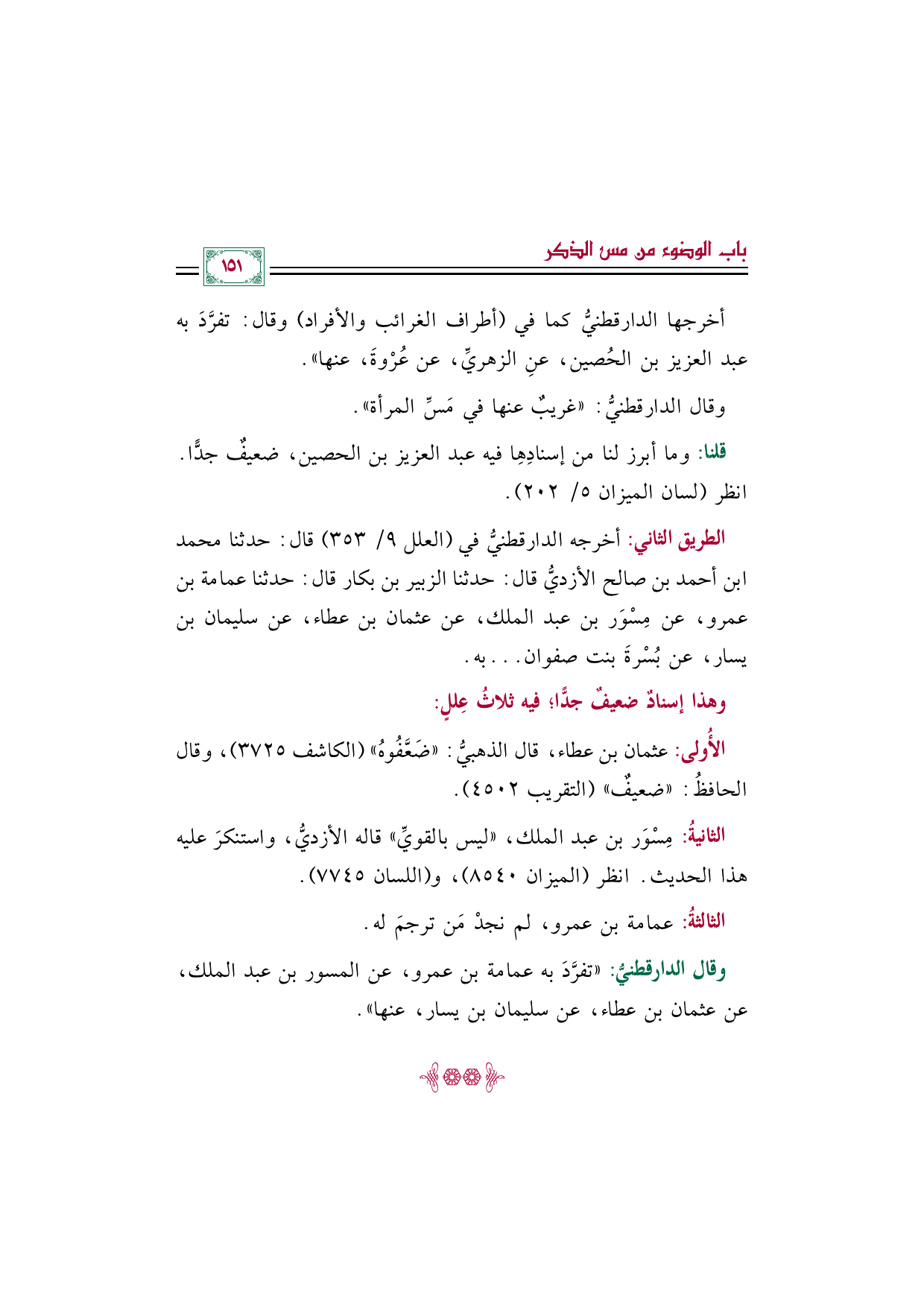 الطريق الثاني: أخرجه الدارقطنيُّ في (العلل ٩/ ٣٥٣) قال: حدثنا محمد بن أحمد بن صالح الأزديُّ قال: حدثنا الزبير بن بكار قال: حدثنا عمامة بن عمرو، عن مِسْوَر بن عبد الملك، عن عثمان بن عطاء، عن سليمان بن يسار، عن بُسْرةَ بنت صفوان ... به.