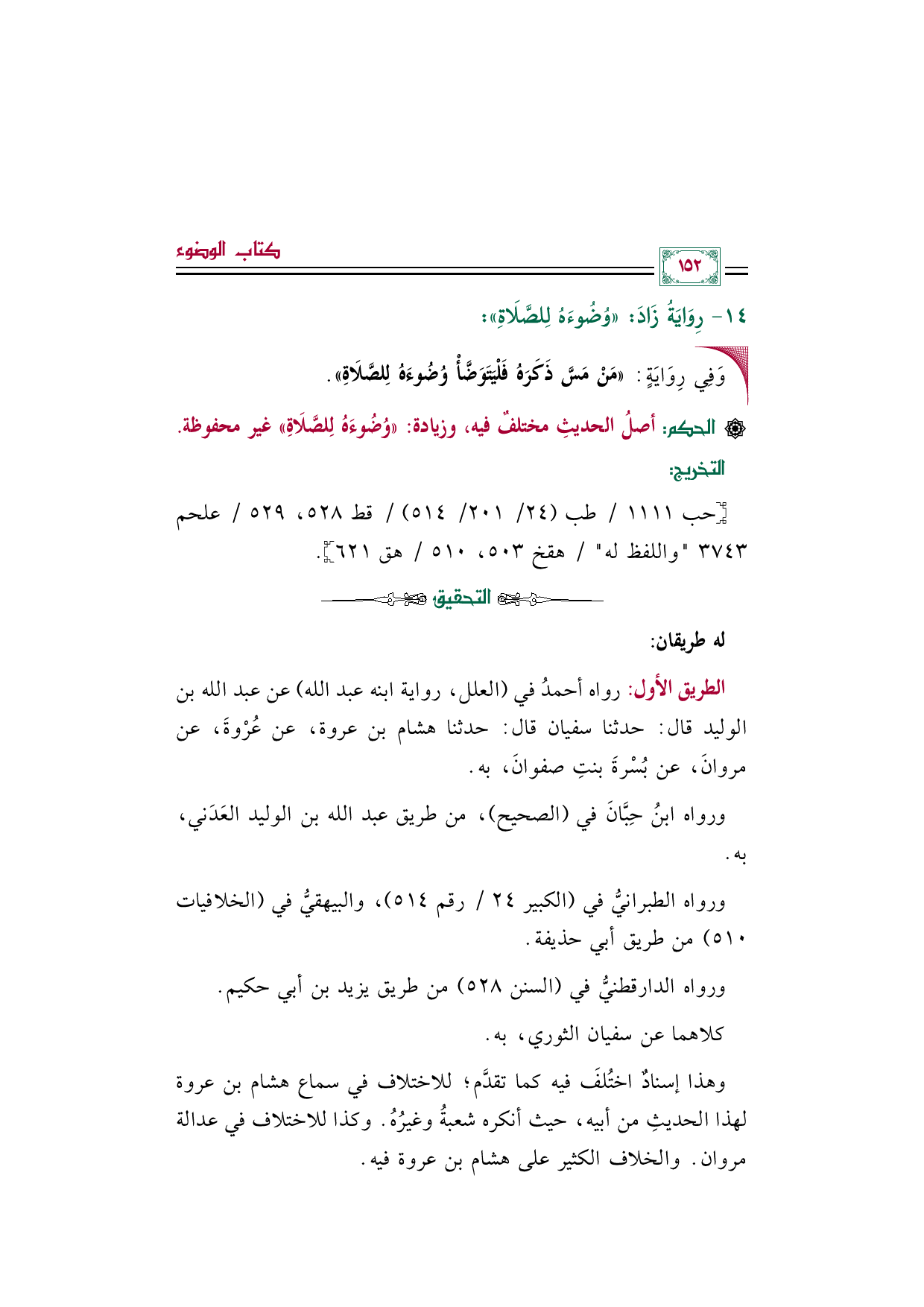 الطريق الأول: رواه أحمدُ في (العلل، رواية ابنه عبد الله) عن عبد الله بن الوليد قال: حدثنا سفيان قال: حدثنا هشام بن عروة، عن عُرْوةَ، عن مروانَ، عن بُسْرةَ بنتِ صفوانَ، به.