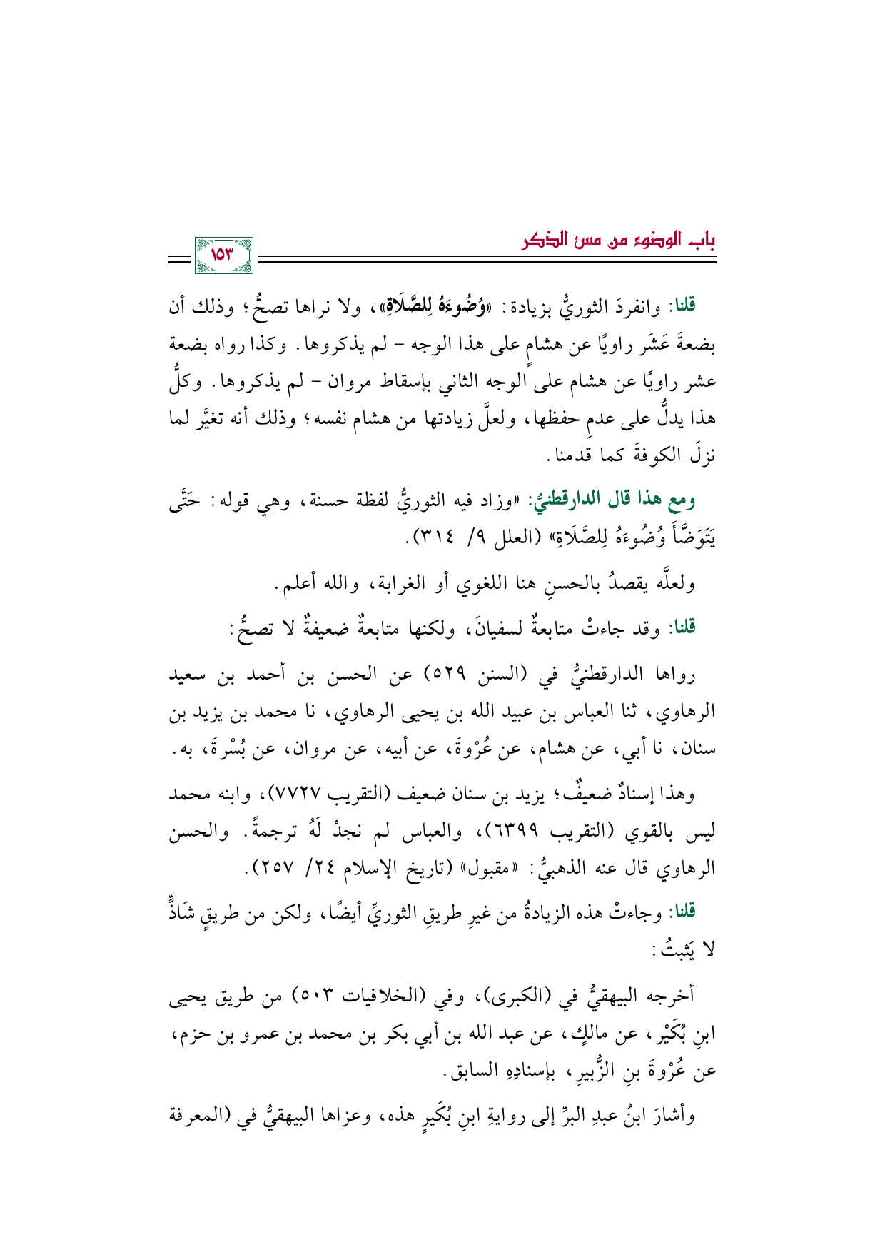 رواها الدارقطنيُّ في (السنن ٥٢٩) عن الحسن بن أحمد بن سعيد الرهاوي، ثنا العباس بن عبيد الله بن يحيى الرهاوي، نا محمد بن يزيد بن سنان، نا أبي، عن هشام، عن عُرْوةَ، عن أبيه، عن مروان، عن بُسْرةَ، به.