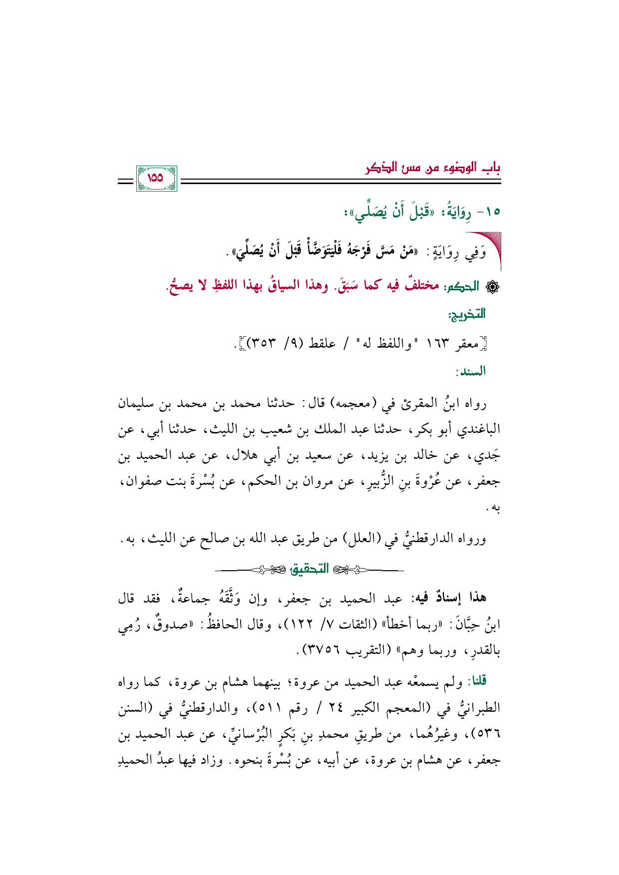 قلنا: ولم يسمعْه عبد الحميد من عروة؛ بينهما هشام بن عروة، كما رواه الطبرانيُّ في (المعجم الكبير ٢٤/ رقم ٥١١)، والدارقطنيُّ في (السنن ٥٣٦)، وغيرُهُما، من طريقِ محمدِ بنِ بَكرٍ البُرْسانيِّ، عن عبد الحميد بن جعفر، عن هشام بن عروة، عن أبيه، عن بُسْرةَ بنحوه. وزاد فيها عبدُ الحميدِ
