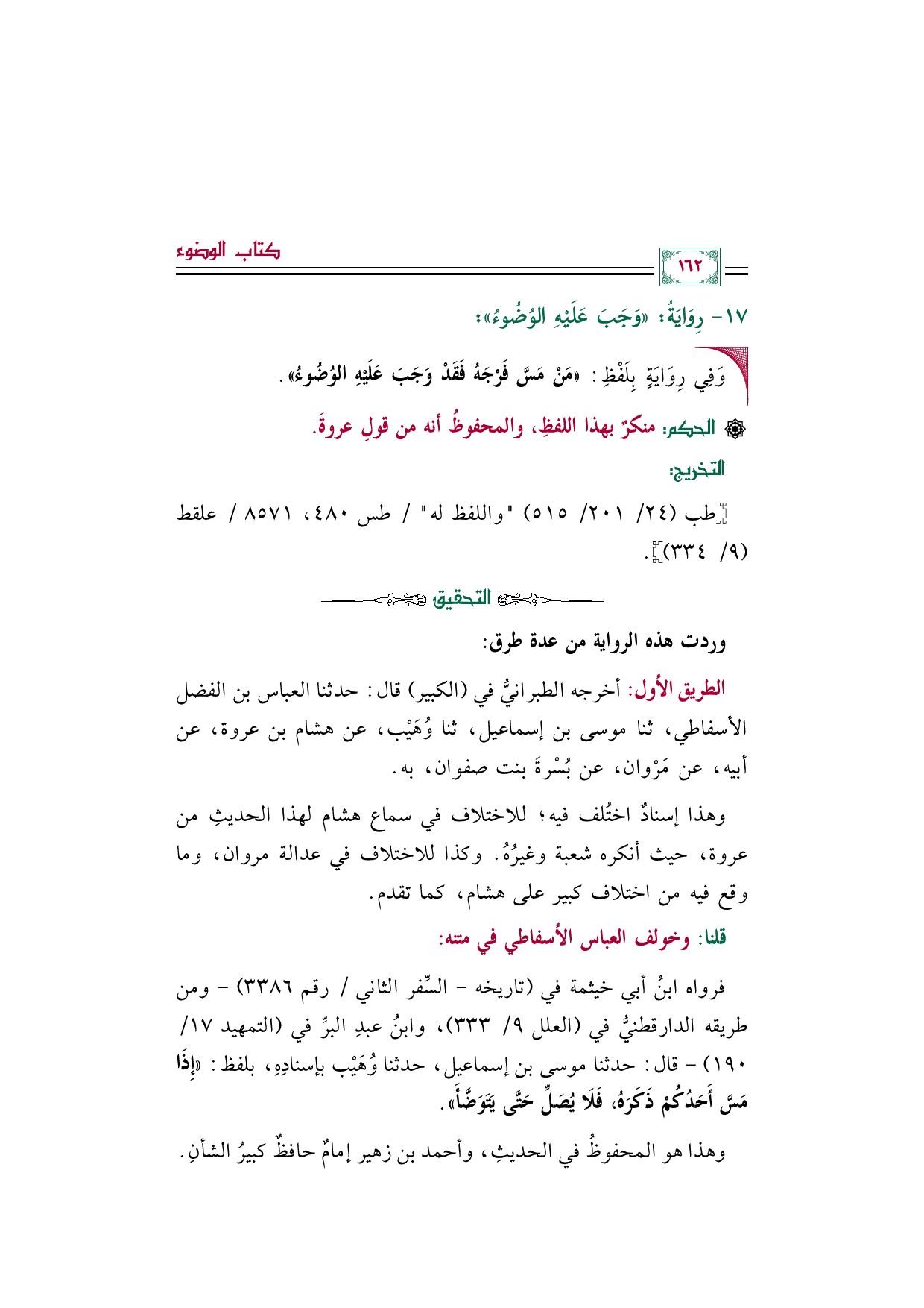 الطريق الأول: أخرجه الطبرانيُّ في (الكبير) قال: حدثنا العباس بن الفضل الأسفاطي، ثنا موسى بن إسماعيل، ثنا وُهَيْب، عن هشام بن عروة، عن أبيه، عن مَرْوان، عن بُسْرةَ بنت صفوان، به.