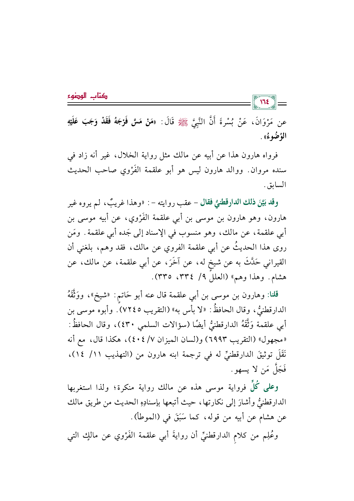وقد بَيَّنَ ذلك الدارقطنيُّ فقال -عقب روايته-: ((وهذا غريبٌ، لم يروه غير هارون، وهو هارون بن موسى بن أبي علقمة الفَرْوي، عن أبيه موسى بن أبي علقمة، عن مالك، وهو منسوب في الإسناد إلى جَده أبي علقمة. ومَن روى هذا الحديثُ عن أبي علقمة الفروي عن مالك، فقد وهم، بلغني أن القيراني حَدَّثَ به عن شيخٍ له، عن آخَرَ، عن أبي علقمة، عن مالك، عن هشام. وهذا وهم)) (العلل ٩/ ٣٣٤، ٣٣٥).