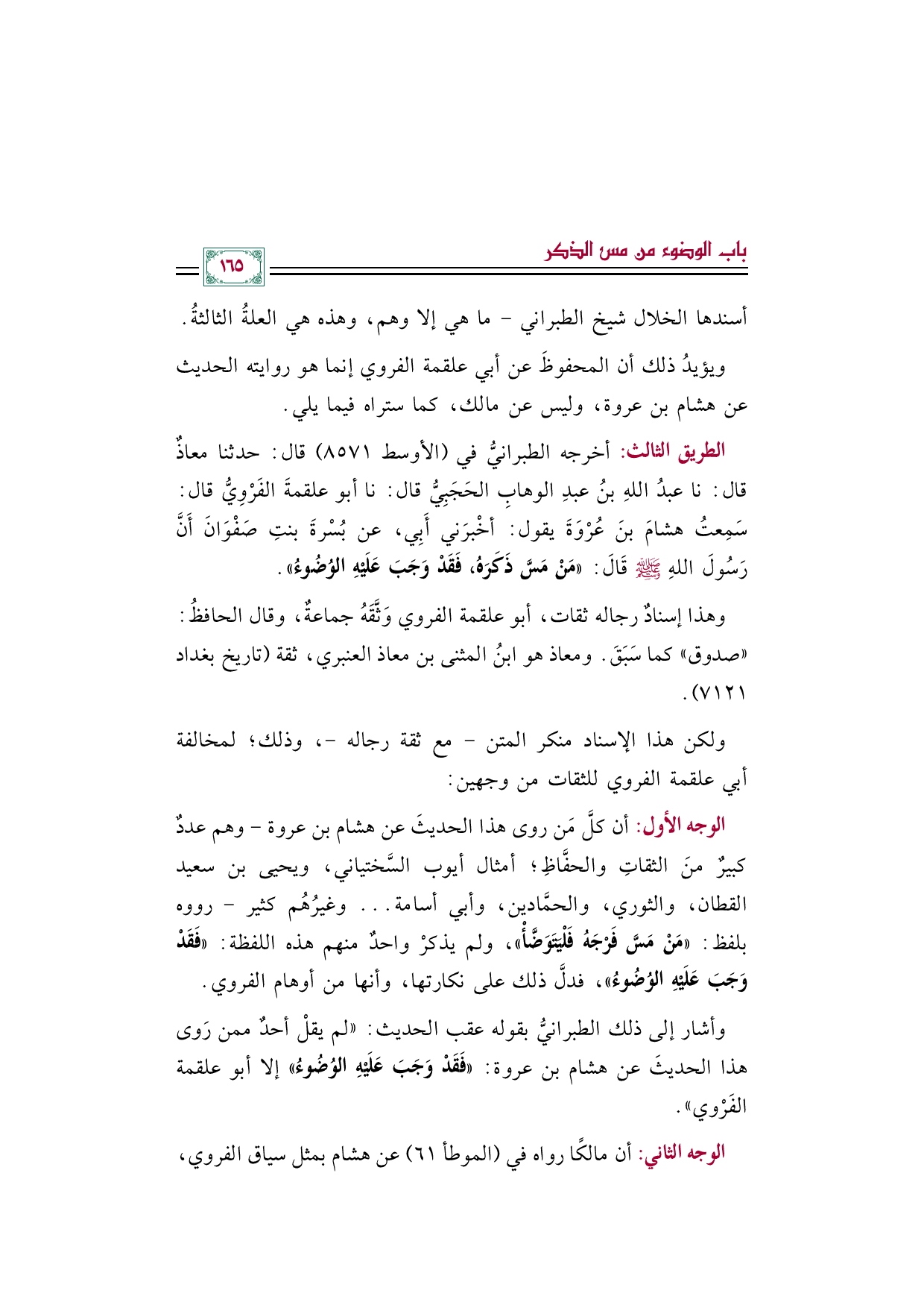 وأشار إلى ذلك الطبرانيُّ بقوله عقب الحديث: ((لم يقلْ أحدٌ ممن رَوى هذا الحديثَ عن هشام بن عروة: ((فَقَدْ وَجَبَ عَلَيْهِ الوُضُوءُ)) إلا أبو علقمة الفَرْوي)).