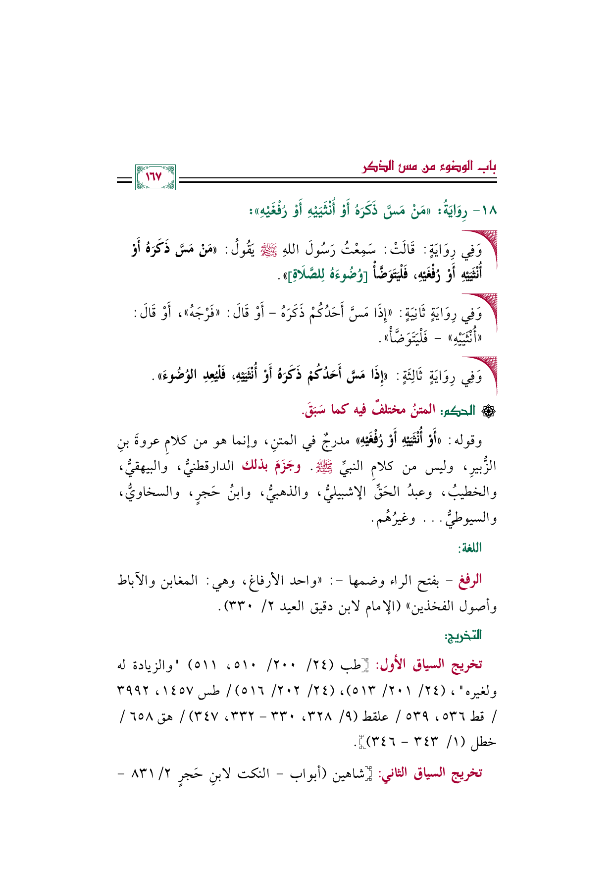 وقوله: ((أَوْ أُنْثَيَيْهِ أَوْ رُفْغَيْهِ)) مدرجٌ في المتنِ، وإنما هو من كلامِ عروةَ بنِ الزُّبيرِ، وليس من كلامِ النبيِّ صلى الله عليه وسلم. وجَزَمَ بذلك الدارقطنيُّ، والبيهقيُّ، والخطيبُ، وعبدُ الحَقِّ الإشبيليُّ، والذهبيُّ، وابنُ حَجرٍ، والسخاويُّ، والسيوطيُّ. ... وغيرُهُم.