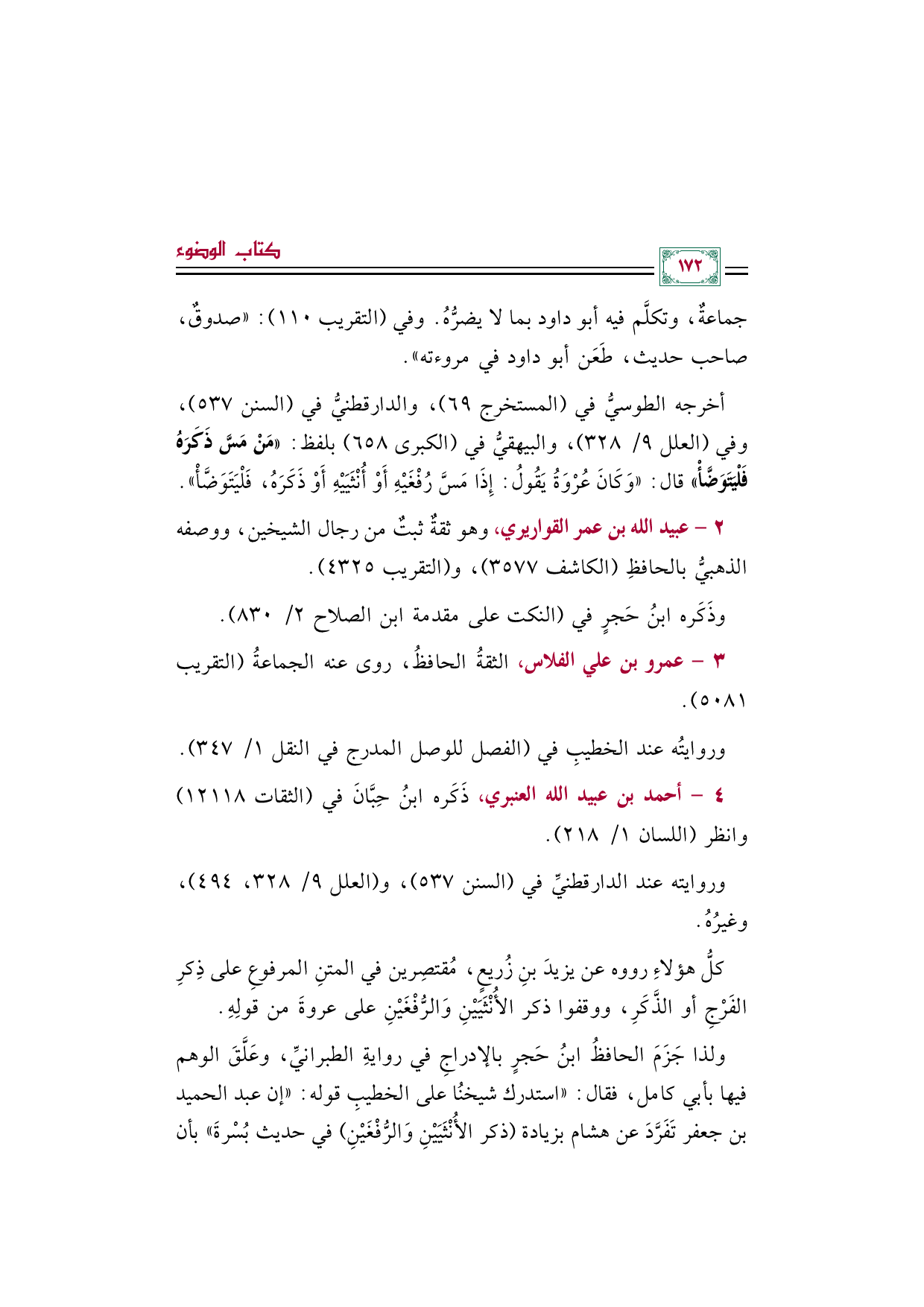 كلُّ هؤلاءِ رووه عن يزيدَ بنِ زُريعٍ، مُقتصِرين في المتنِ المرفوعِ على ذِكرِ الفَرْجِ أو الذَّكَرِ، ووقفوا ذكر الأُنْثَيَيْنِ وَالرُّفْغَيْنِ على عروةَ من قولِهِ.